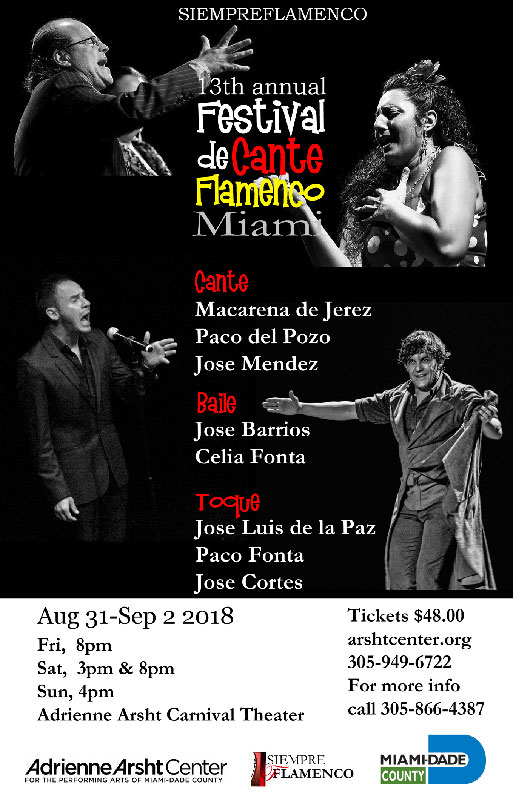 Celebrating 13 years of Cante Flamenco in Miami, Siempre Flamenco’s festival returns to the Arsht Center for a spectacular production featuring Spain’s brightest stars. This year’s festival presents acclaimed Spanish singers Macarena de Jerez, Jose Mendez, and Paco del Pozo, exceptional guitarists Jose Luis de la Paz, Jose Cortes, and world renowned dancer Jose Barrios. Siempre Flamenco’s founding members Paco and Celia Fonta will join the ensemble with their guitar and dance respectively and complete this terrific lineup of flamenco artists. Intimate! Passionate! Raw and bewitching! You will not want to miss this mesmerizing and passionate performance! Tickets $48.00 arshtcenter.org 305-949-6722 For more info call 305-866-4387
