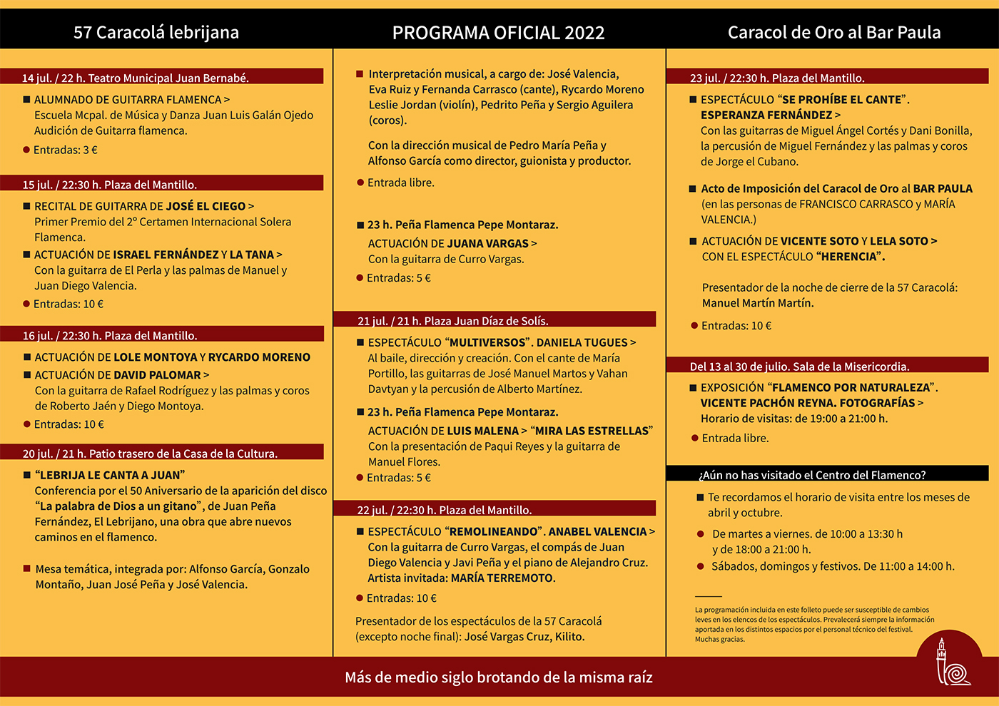 57 Caracola Lebrijana 2022 Del 14 al 23 de julio 2022 Caracolá de oro al Bar Paula PROGRAMACIÓN COMPLETA Programa Caracolá 2022 Descubre más desde Revista DeFlamenco.com Suscríbete y recibe las últimas entradas en tu correo electrónico. Escribe tu correo electrónico… Suscribirse + Añadir Google Calendar Exportación + iCal / Outlook Etiquetas: Caracolá Fecha 14 - 23 Jul 2022 Finalizdo! Etiquetas Conciertos de Flamenco Zonas Sevilla Compartir este evento Recomendamos Mié - Vie, 17 - 19 Dic 2025 El Choro y Paula Rodríguez “In situ” – Flamenco Real Vie, 26 Dic 2025 “FOSFORITO EN EL RECUERDO” Bernardo Miranda (cante) y Luis Medina (guitarra) Lun, 29 Dic 2025 Leonor Leal “¡Ahora bailo yo!” – Materiales para una charla bailada Mar, 30 Dic 2025 “Escuela Bolera y Guitarra Española” – Ateneo de Madrid Sáb, 03 Ene 2026 “El Cante por Derecho (II)” – Ezequiel Benítez y Paco León – Ateneo de Madrid ¡No hay eventos!