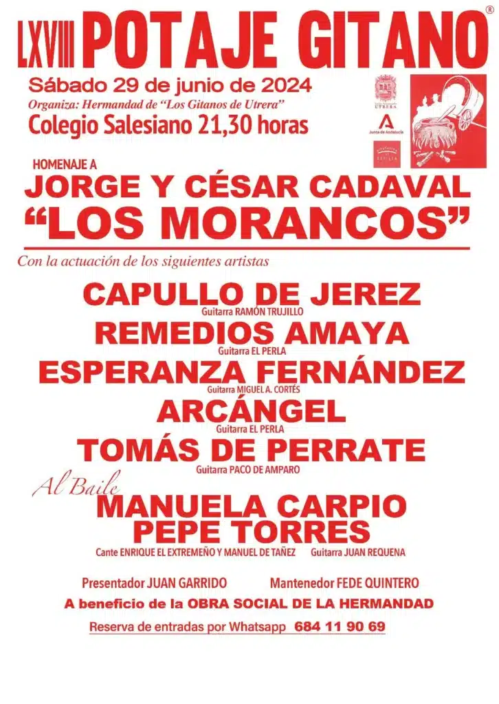 A lo largo de sus 45 años de brillante y exitosa trayectoria artística, “Los Morancos” han recibido numerosos premios, distinciones y galardones, entre ellos la Medalla de la Ciudad de Sevilla, la Medalla de Oro de la Provincia de Sevilla o la Medalla de Andalucía de las Artes. A ellos se unirá con todos los honores este merecido y sentido homenaje que la Hermandad de los Gitanos de Utrera les ofrece en su Potaje Gitano, el primer festival flamenco del mundo.