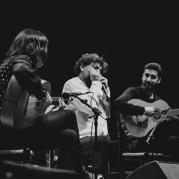 La armónica de Antonio Serrano se mezcla con dos linajes guitarrísticos más importantes del flamenco. Antonio Sanchez, sobrino de Paco de Lucía y José del Tomate, hijo de Tomatito entrelazan las cuerdas de sus guitarras creando un tejido sonoro poderoso que cimienta esta pirámide musical.