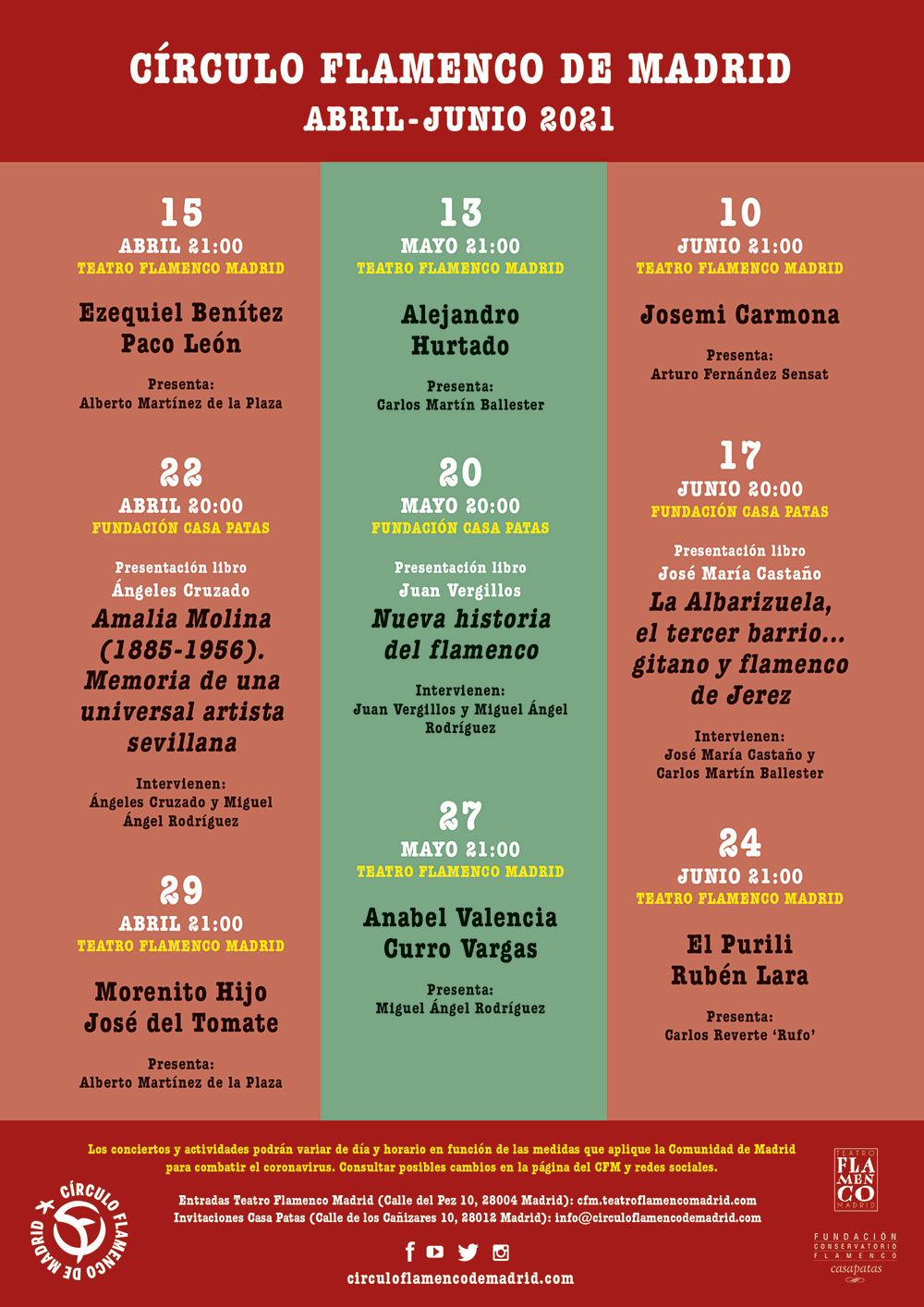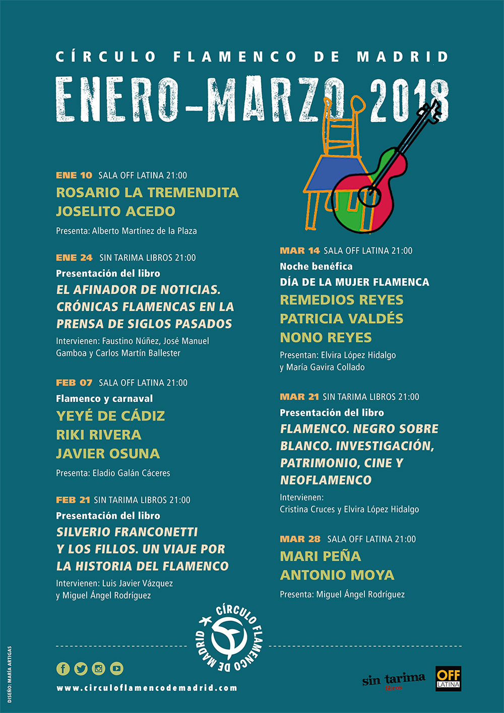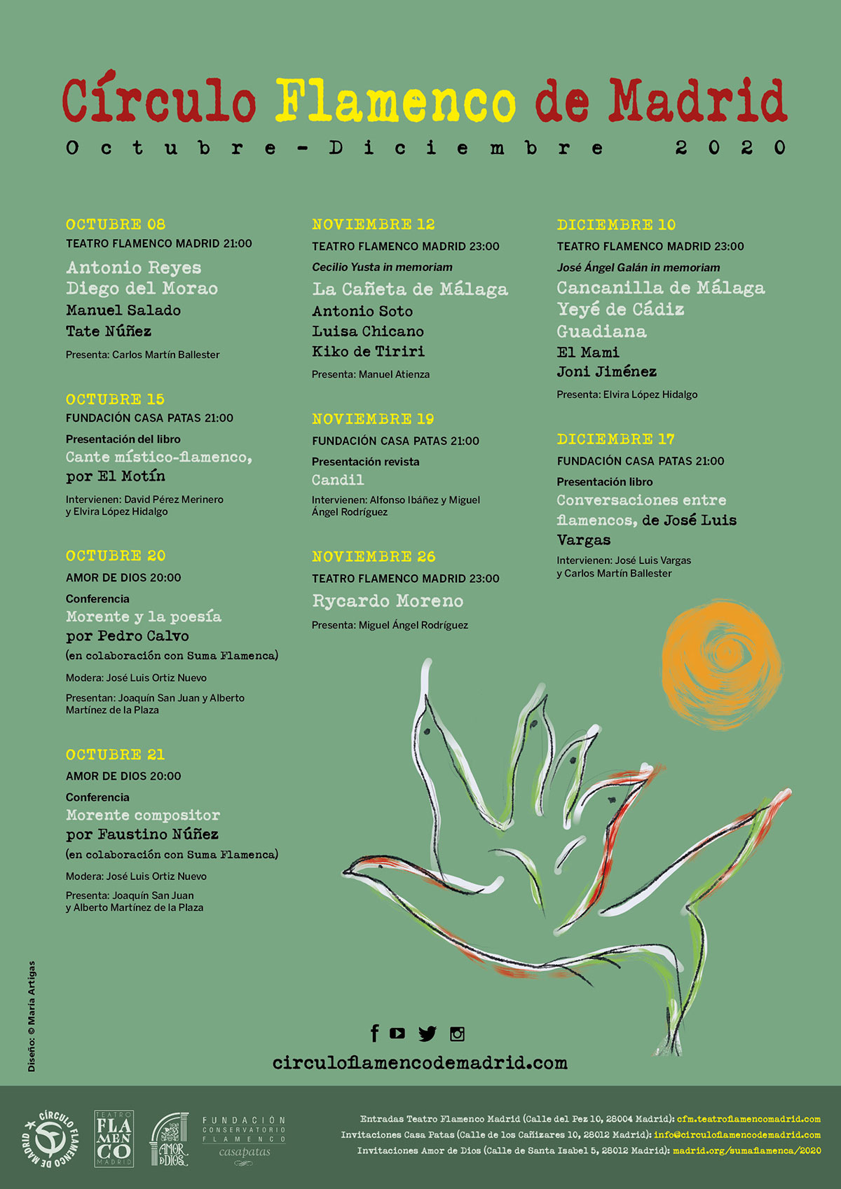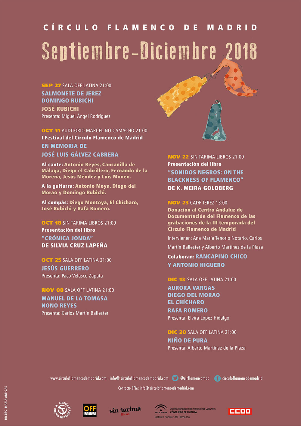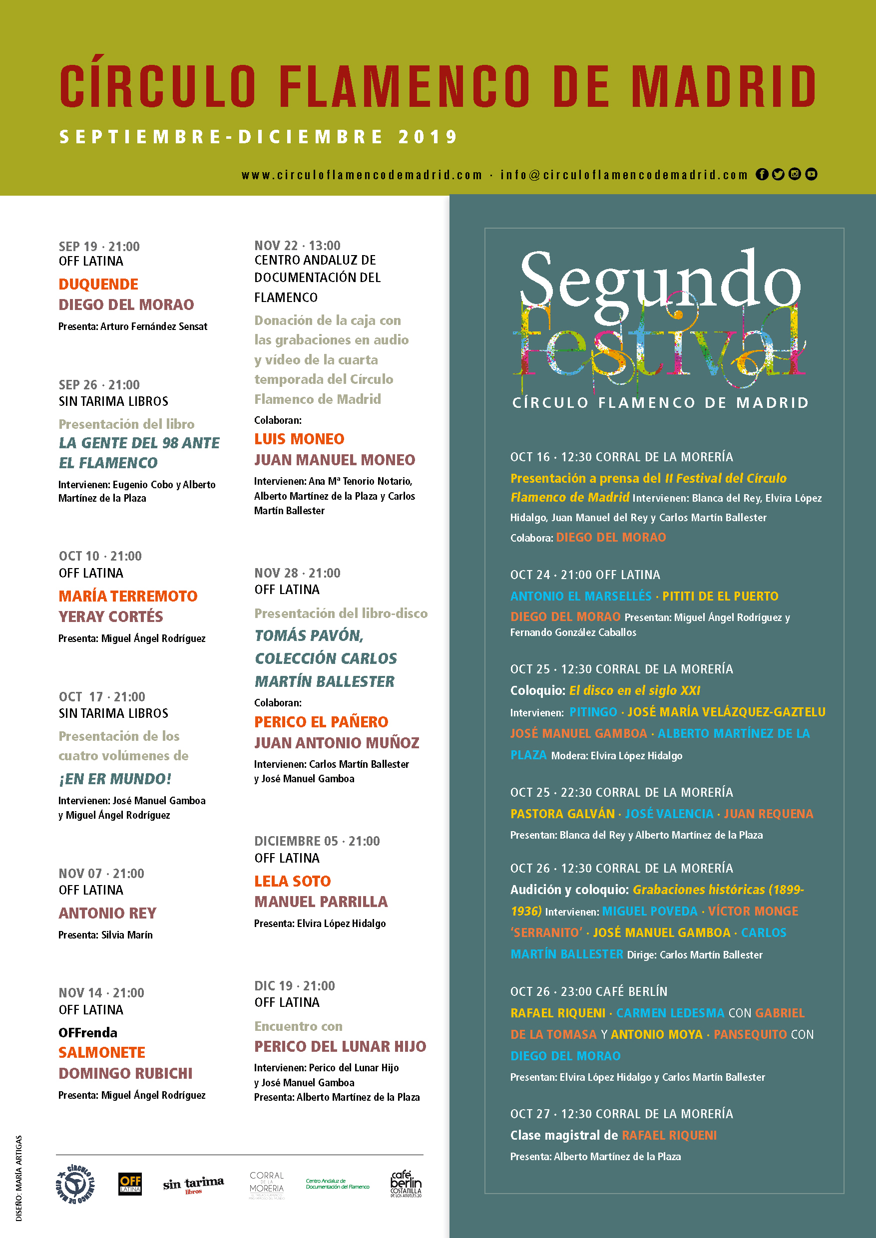 Para finalizar, agradecer a las entidades que nos acogen o acompañan en este viaje anual a través del mejor flamenco: Teatro Flamenco Madrid, Real Casino de Madrid, Corral de la Morería, Sin Tarima Libros, Centro Andaluz de Documentación del Flamenco, Matadero Madrid, Asociación Amigos del Central, Asociación Cultural Flamenca Las Cadenas y Peña Cultural Flamenca Torres Macarena.