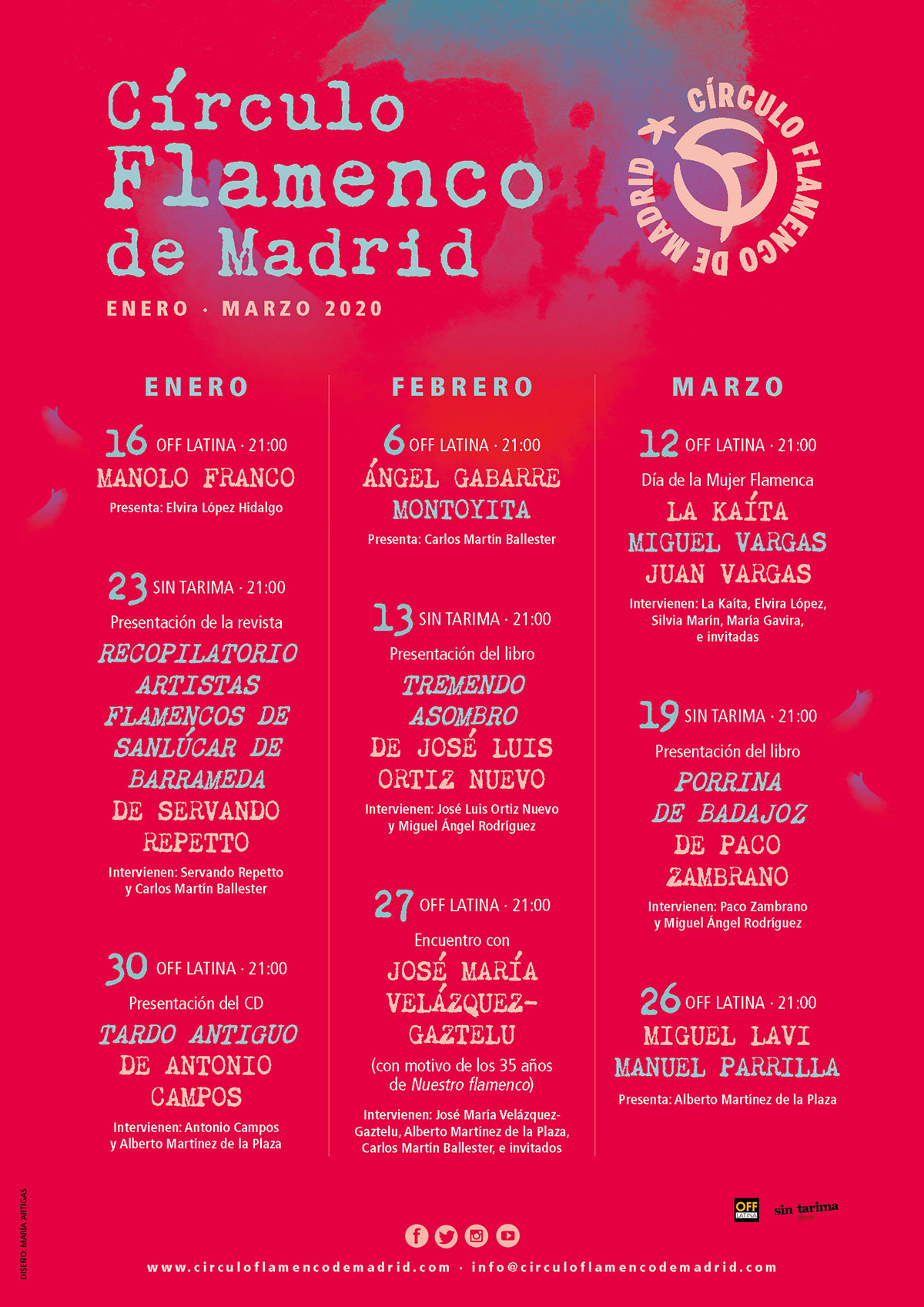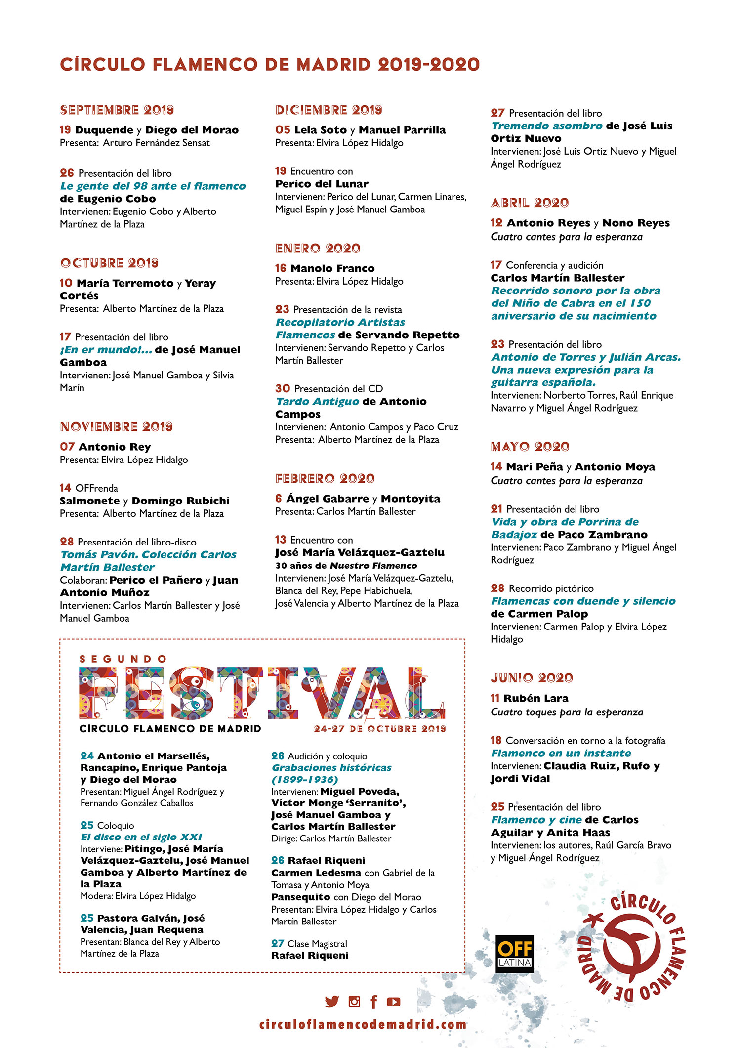 Continuaremos con el convenio firmado con el Real Casino de Madrid, en virtud del cual los socios del CFM podrán asistir a todas las actividades programadas dentro del Foro Flamenco José Ángel Galán: dos conferencias y tres conciertos protagonizados por La Kaíta, Sandra Carrasco y Vicente Soto.