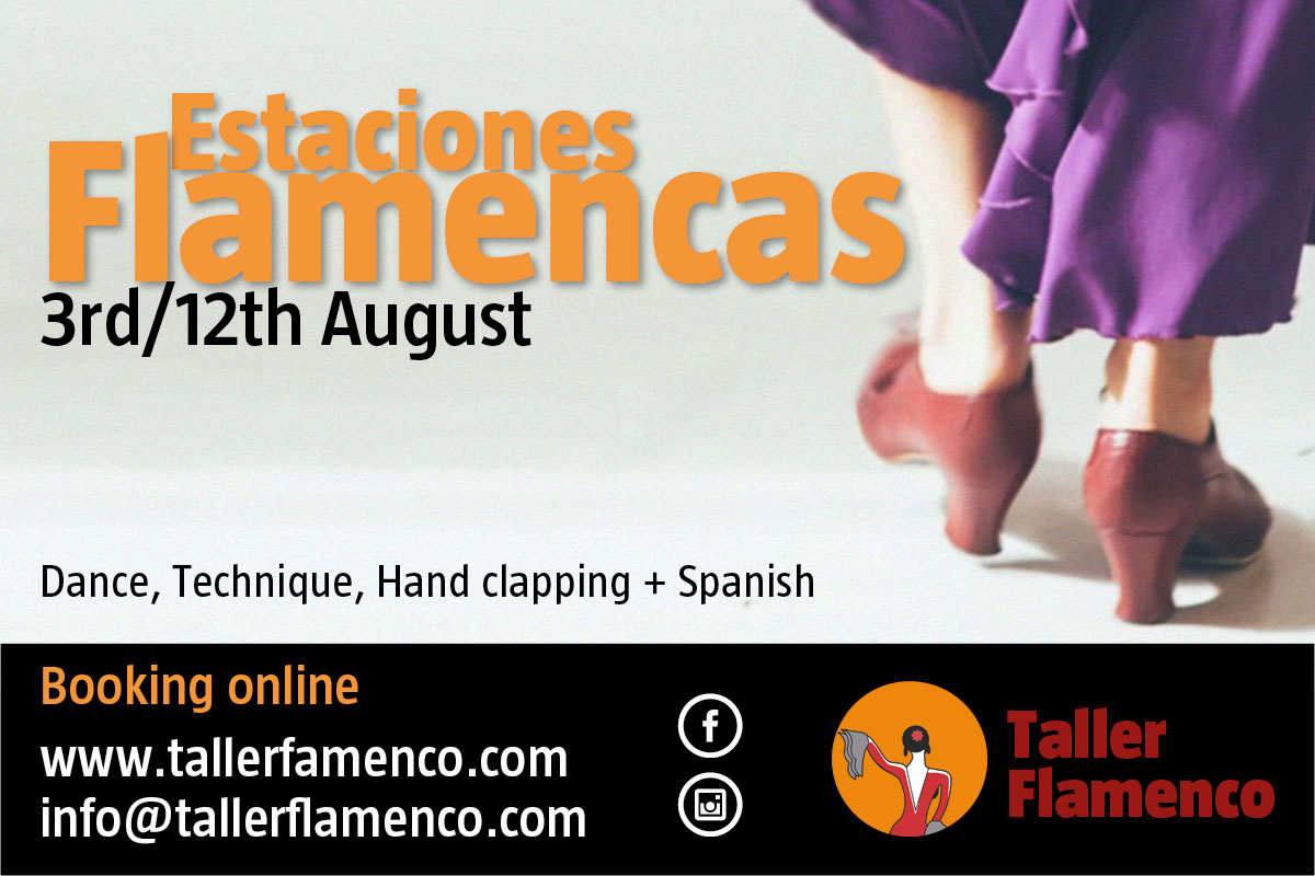 2020 Disfruta de este curso especial compuesto de clases de Baile y técnica + Compás y palmas + Español para extranjeros en cualquiera de las tres convocatorias que tenemos preparadas: 2/13 de Marzo – 1/12 de Junio – 3/14 de Agosto – 2020 Dos semanas en Invierno, dos semanas en Primavera y dos semanas en Verano para vivir intensamente el flamenco. Una combinación de cursos con una amplia programación de actividades relacionadas con el mundo del flamenco, como forma más inmediata de aproximación a una de las manifestaciones más relevantes y genuinas de nuestra cultura. La combinación de cursos de baile y técnica con español y compás & palmas conforman la base de Estaciones Flamencas, en las que Taller Flamenco garantiza la atención personal a todos nuestros alumnos, configurando grupos reducidos en todos los cursos. El cuerpo definitivo de Estaciones Flamencas se alcanza con la diversidad de actividades paralelas, como visitas culturales con las clases de español, y atención a todos los eventos de flamenco programados en estas fechas. Dos semanas en Invierno, dos semanas en Primavera y dos semanas en Verano en las que los sueños de una variedad de sentires flamencos se harán realidad. Entre sentires virtuales y la realidad soñada. Opción 1 – Nivel principiante 20 horas Baile y Técnica 15 horas Español* 4 horas Compás & Palmas * Todos los niveles Opción 2 – Otros niveles 30 horas Baile y Técnica 15 horas Español* 4 horas Compás & Palmas * Todos los niveles http://www.tallerflamenco.com/cursos/curso-estaciones-flamencas