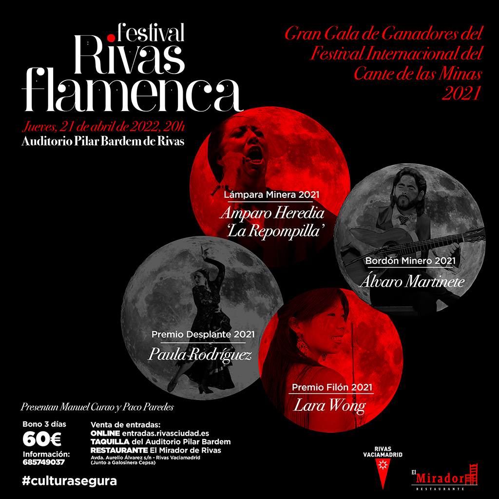 Lugar: Auditorio Pilar Bardem de Rivas Vaciamadrid. Entradas: la entrada -60 €- incluye las funciones de los tres días. Venta de entradas en la taquilla del teatro, en el RESTAURANTE EL MIRADOR DE RIVAS o en al web entradas.rivasciudad.es Día 22 – Rancapino Chico, Jesús Méndez, Amalia Andújar, Miguel de Tena, Juan Antonio Sánchez Día 23 – Sara Baras «Alma» Ganadores Cante de las Minas de La Unión (Murcia) Amparo “la Repompilla”, Lámpara Minera 2021 Álvaro Martinete, Bordón Minero 2021 Paula Rodríguez, Premio Desplante 2021 Lara Wong, Premio Filón 2021