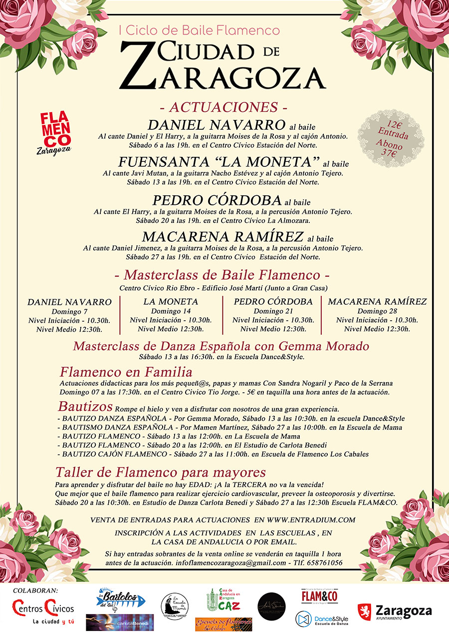 Estas actividades se realizarán en su mayoría en las diferentes escuelas de flamenco y danza española de la ciudad dando paso a la participación importante de estos centros. Para terminar, agradecer a la red de centros cívicos del Ayuntamiento de Zaragoza que sin ellos no sería posible la realización del ciclo.