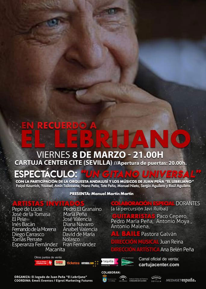 Un repaso por la discografía más relevante de uno de los Flamencos más importantes de todos los tiempos, con proyección de un audiovisual que servirá de hilo conductor de todo el homenaje y acompañado de la banda de músicos junto con la Orquesta Andalusí que “Lebrijano” llevaba en sus espectáculos, incluido al gran músico marroquí Faiçal Kourrich. Cada Artista invitado, interpretará, dentro de un contexto creativo, un tema de “Lebrijano”, terminando con un final al más puro Juan Peña. Recaudación de fondos para la creación de la Fundación Juan Peña “El Lebrijano, un Gitano Universal”, para la protección y proyección de su Legado. Artistas Invitados Pepe de Lucía, José de la Tomasa, El Pele, Inés Bacán, Fernando de La Morena, Diego Carrasco, Tomás de Perrate, Esperanza Fernández, Pedro El Granaino, María Peña, José Valencia, Diana Navarro, Anabel Valencia, David de María, Nolasco, Macanita, Fran Fernández. Colaboración especial Dorantes (a la percusión Javi Ruibal) Dirección Artística Ana Belén Peña Dirección Musical Juan Reina EntradasDescubre más desde Revista DeFlamenco.com