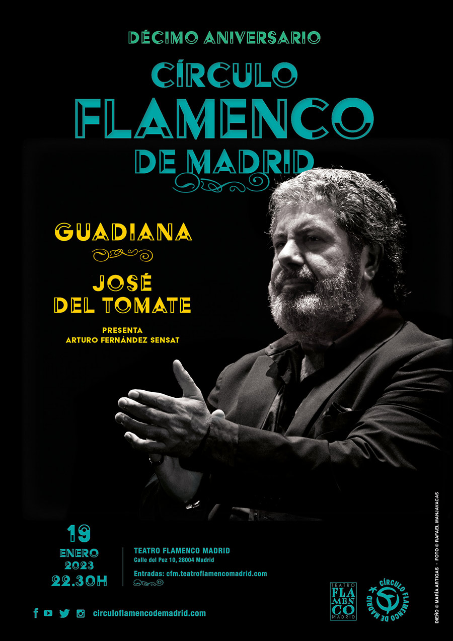 El jueves 19 de enero continua el ciclo de conciertos de la décima temporada del Círculo Flamenco de Madrid con una cita especial protagonizada por Guadiana y José del Tomate. Comenzará a las 22:30 —con la presentación de Arturo Fernández Sensat— en el Teatro Flamenco Madrid (Teatro Alfil), situado en la calle del Pez 10. El cartel que se adjunta es un diseño de María Artigas.  El público general puede adquirir las entradas en: cfm.teatroflamencomadrid.com