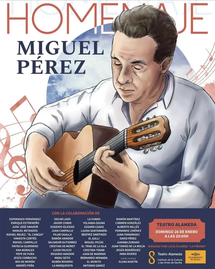 el homenaje que le haremos a nuestro querido Miguel Pérez el próximo 26 de enero en el Teatro Alameda. Con esto queremos celebrarle y agradecerle tanto de lo que ha hecho él en vida por todos nosotros. Esperamos estar a la altura de tu calidad como guitarrista, pero sobre todo como ser humano y compañero. Te queremos y siempre estás en nuestros corazones y camerinos .