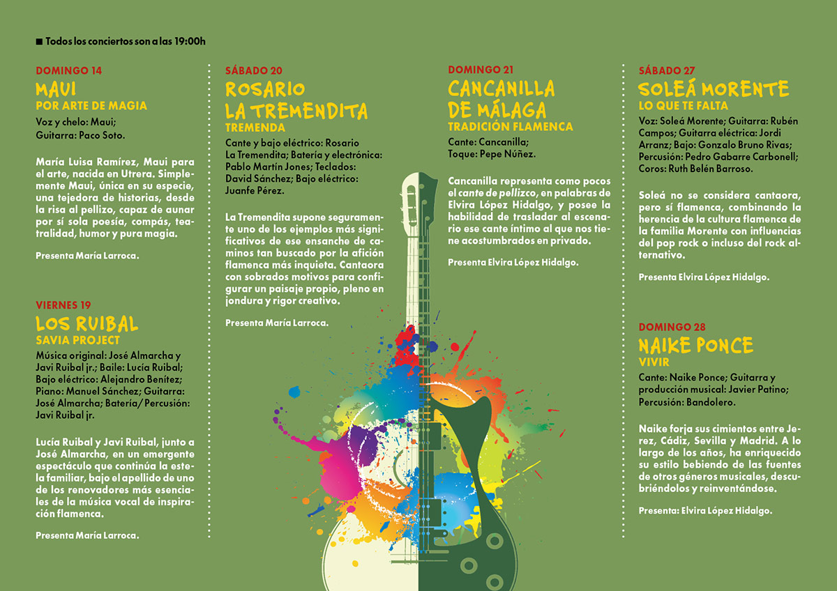 Es una Muestra que pretende reflejar, desde diversos ángulos, algunas esquinas de la evolución del flamenco en los últimos años, a través de algunos artistas que, sin estar a veces encuadrados en los códigos habituales del género, su trayectoria es producto del origen y entorno flamencoandaluz. Contrastes como los que nos ofrecerán Javi Ruibal Trío, La Tremendita, Cancanilla de Málaga, Soleá Morente o Naike Ponce. Artistas de gran categoría todos ellos, con propuestas muy distintas entre sí, que estarán estos días sobre las tablas del Centro Cultural Antonio Machado, de la calle Arcos de Jalón.