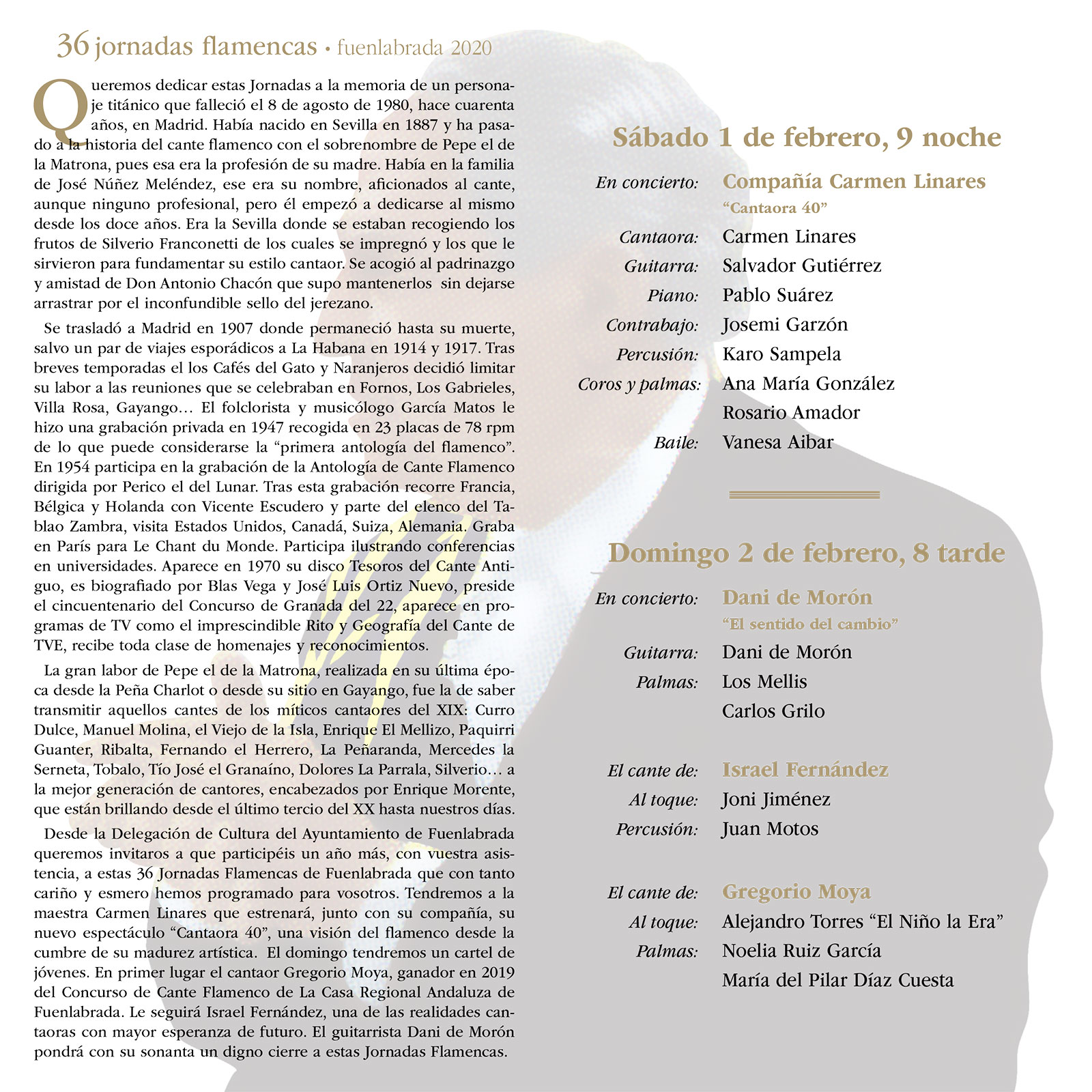 Compañía Carmen Linares presenta CANTAORA 40 Sábado, 1 de Febrero Lugar: Teatro Tomás y Valiente Hora: 21.00 h. Entrada: 11,60 € Venta anticipada: desde el 2 de Enero Domingo, 2 de Febrero Lugar: Teatro Tomás y Valiente Hora: 20.00 h. Entrada: 11,60 € Venta anticipada: desde el 2 de Enero DANI DE MORÓN en concierto El cante de ISRAEL FERNÁNDEZ El cante de GREGORIO MOYA