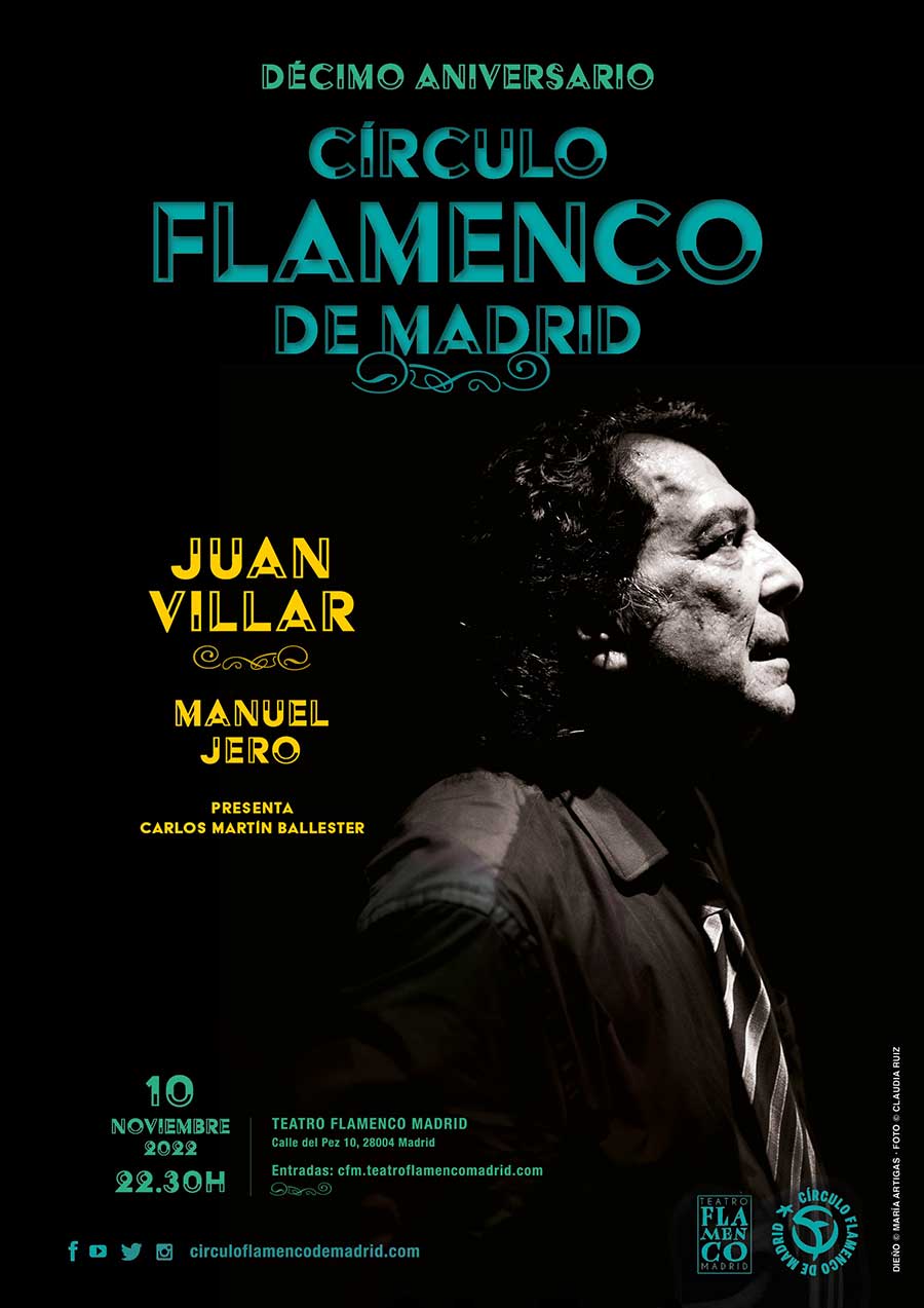 El jueves 10 de noviembre continuaremos el ciclo de conciertos de la décima temporada del Círculo Flamenco de Madrid con la presencia de Juan Villar, acompañado a la guitarra por Manuel Jero. Comenzará a las 22:30 —con la presentación de quien escribe— en el Teatro Flamenco Madrid (Teatro Alfil), situado en la calle del Pez 10. El cartel es un diseño de María Artigas. El público general puede adquirir las entradas en: cfm.teatroflamencomadrid.com