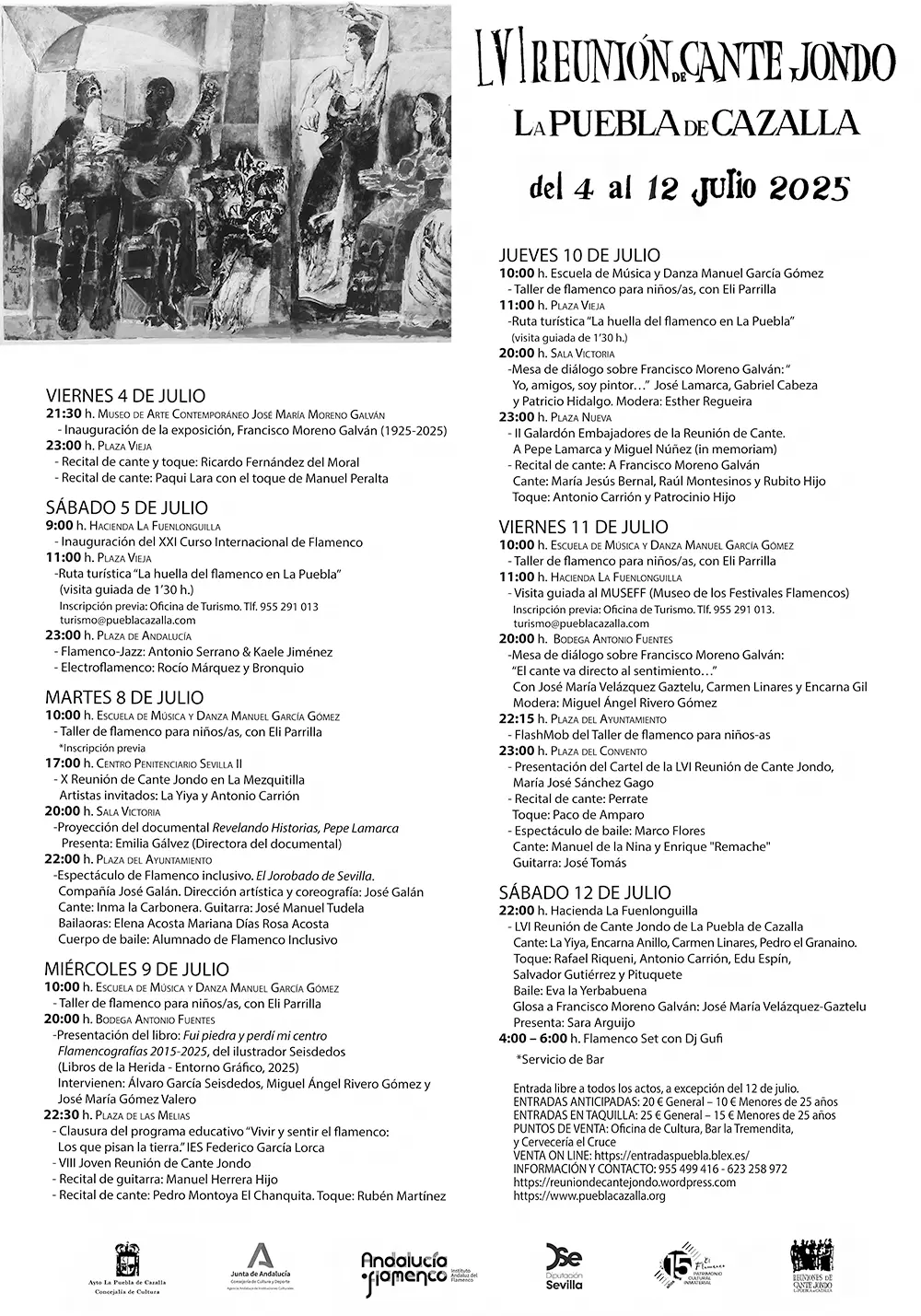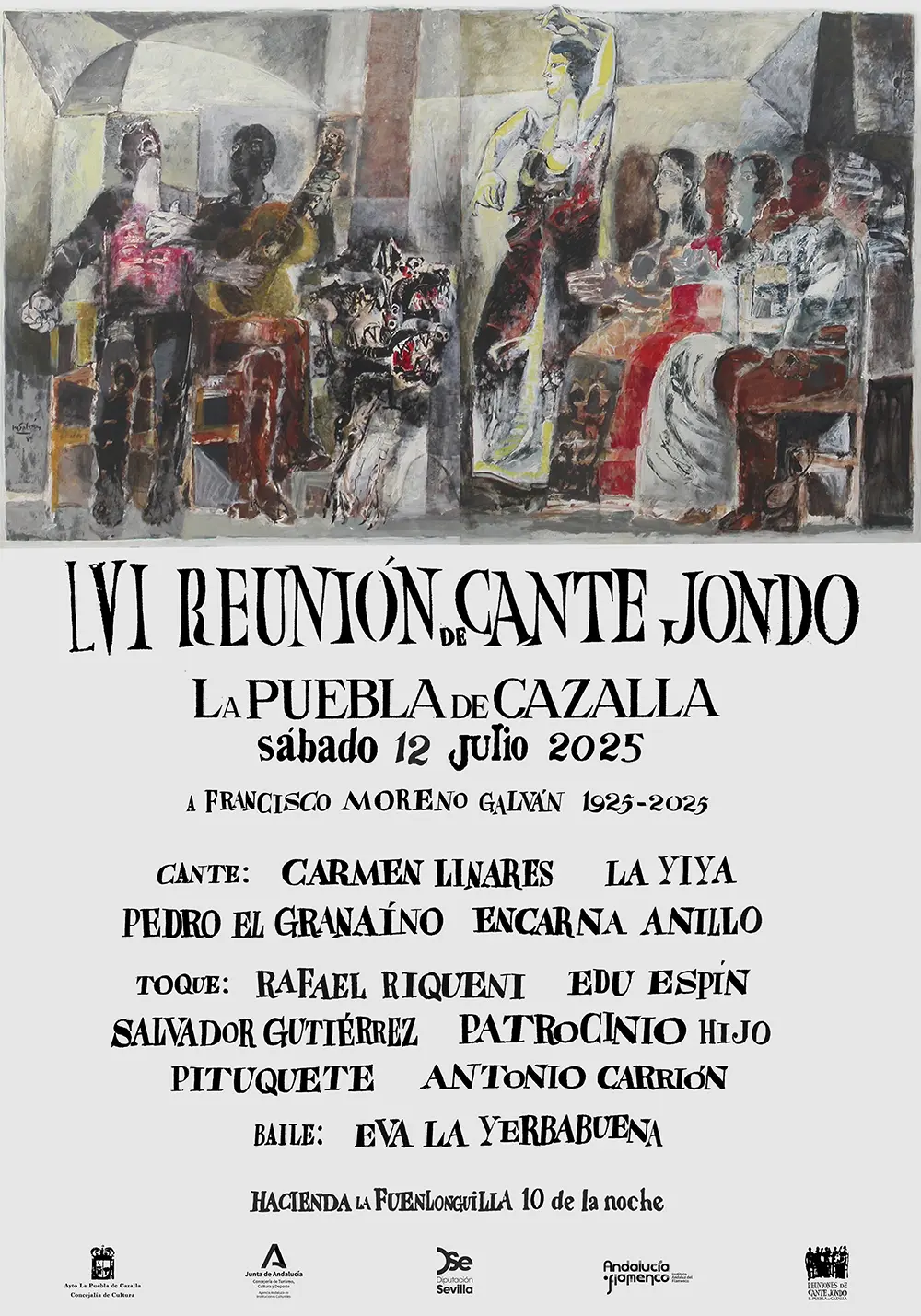 La LVI Reunión de Cante Jondo de La Puebla de Cazalla tendrá lugar el próximo 12 de julio en la Hacienda La Fuenlonguilla, con un cartel encabezado por figuras destacadas del flamenco como Carmen Linares, Rafael Riqueni, Eva Yerbabuena y Pedro El Granaíno, entre otros. Esta edición conmemora el centenario del nacimiento del pintor y poeta Francisco Moreno Galván, cofundador del festival, cuya figura será objeto de diversos actos y homenajes a lo largo del evento.