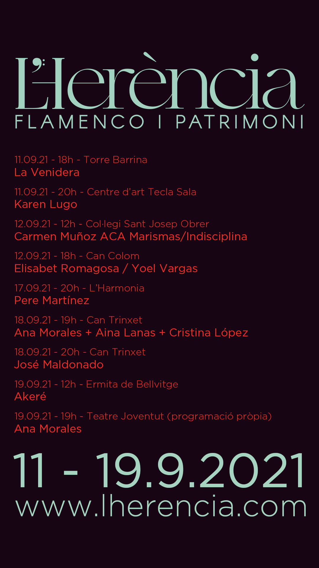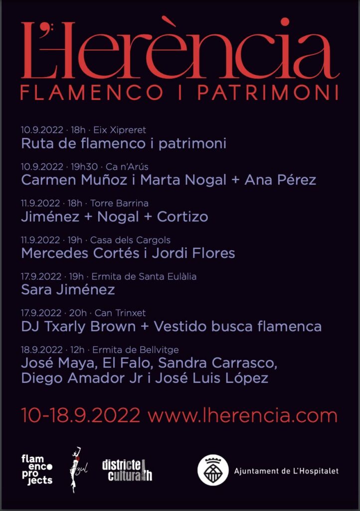 Durante los días 10, 11, 17 y 18 de septiembre se ofrecerán 8 propuestas de danza y música en 7 espacios singulares, todos de acceso libre. La frescura y, en algunos casos, la hibridación entre disciplinas y artistas estará muy presente para representar el flamenco actual, una forma de arte que sabe mantener la tradición sin olvidar la vanguardia y los nuevos códigos artísticos. En la programación de este año podremos disfrutar de artistas reconocidos y de extensa trayectoria como el bailaor José Maya, colaborador de figuras como Marc Anthony, Beyoncé, Keith Richards, Tomatito o Vicente Amigo, y que llevará una experiencia inmersiva única en la Ermita de Bellvitge, acompañado de Rafael Jiménez “Falo”, Sandra Carrasco, Diego Amador Jr y José Luis López. Será la tercera vez que se representa Liturgia en todo el mundo, puesto que previamente solo se ha podido ver en París y Sevilla. También tendremos la oportunidad de descubrir proyectos de jóvenes talentos como el de Sara Jiménez, que con Adioses se acompaña del bailarín catalán Martí Corbera y la artista Niña de Espejo, y bajo la dirección escénica de Juan Kruz Díaz de Garaio Esnaola. En L’Herència de este año también podremos ver coproducciones como el estreno absoluto de Prima par de Carmen Muñoz y Marta Nogal, o colaboraciones internacionales como la de Sonate de Ana Pérez, llegada del Festival Flamenco Azul de Marsella. Estos últimos dos espectáculos irán precedidos de la sesión inaugural, el sábado 10 de septiembre a las 18h, con un recorrido guiado por diferentes espacios patrimoniales del Centro de la ciudad acompañado de intervenciones artísticas de alumnas del municipio, coreografiadas por Marina Paje, y con cantaores de Tertulia Flamenca de L’ Hospitalet. Con la intención de reconectar con artistas catalanes que han acabado forjando su carrera fuera, L’Herència llevará la cantaora Mercedes Cortés y el guitarrista Jordi Flores, ambos barceloneses residentes en Sevilla que ofrecerán un recital en la Casa dels Cargols, uno de los pocos ejemplos de arquitectura modernista de L’Hospitalet. En la línea de las propuestas de improvisación iniciada a la última edición entre artistas del flamenco y artistas que se relacionan desde sus propios lenguajes, este año veremos un encuentro inédito y casual entre las hermanas Lorena y Marta Nogal, los hermanos Pol y Guillem Jiménez, y el músico Mario G. Cortizo. El programa se completará en el espacio Can Trinxet con el reconocido dj y diseñador gráfico especializado en música negra afroamericana, rumba y flamenco-fusión Txarly Brown, el mercado de ropa de segunda mano “Vestido busca flamenca” y la foodtruck del bar Córdoba, el emblemático bar de “tapas” que resiste en el barrio de Pubilla Casas de L’Hospitalet.