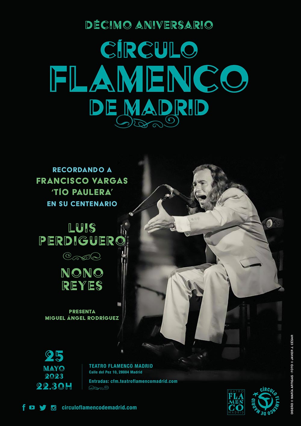 El jueves 25 de mayo continua el ciclo de conciertos de la décima temporada del Círculo Flamenco de Madrid con una cita protagonizada por Luis Perdiguero, que estará acompañado a la guitarra por Nono Reyes, concierto que dedicaremos a la memoria de Francisco Vargas ‘Tío Paulera’. Comenzará a las 22:30 —con la presentación de Miguel Ángel Rodríguez— en el Teatro Flamenco Madrid (Teatro Alfil), situado en la calle del Pez 10. El cartel que se adjunta es un diseño de María Artigas. El público general puede adquirir las entradas en: cfm.teatroflamencomadrid.com