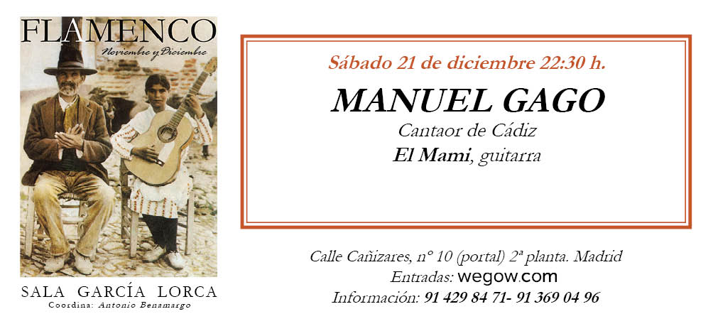 Manuel GagoMANUEL GAGO nació en Cádiz el día 30 de noviembre del año de 1971, en el seno de una familia de cantaores. Empezó a cantar a los cinco años y los catorce ya cantaba en festivales de flamenco con figuras como Juan Villar, Charo Lobato o Rancapino. Con 15 años gana premios importantes de Certámenes de cante en ANDALUCIA.