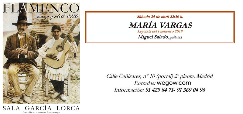 EntradasMaría Vargas – Sala García LorcaMaría Vargas nació en Sanlúcar de Barrameda (Cádiz) Ya a la edad de 7 años cantaba por Siguirillas, Soleá y Bulerías entre otros cantes. Su padre y maestro, Manuel Vargas, cantaba de locura a pesar de no ser profesional y venía de una extensa familia de cantaores como su abuelo «Juan Vargas» o su bisabuelo «Tomás el Nitri», (familia de «Félix Serrano» de Sanlúcar), que fue el ganador de la primera Llave de Oro del Cante Flamenco. La primera vez que María cantó en público tenía 9 años y fue en su pueblo natal, durante la Semana Santa cantándole desde un balcón por Saetas a la Virgen de los Dolores y al Cristo de la Misericordia. Formó tal revolución que, a partir de ahí, ya empezaron a llamarle para trabajar en numerosas fiestas particulares y, en un concurso de Sanlúcar, se llevó los primeros premios cantando por Bulerías, Soleá y Siguirillas.