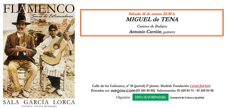 Sábado 16 de marzo 2019 – 22:30hMiguel de Tena, cantaorAntonio Carrión, guitarraMiguel de Tena – Sones de Extremadura