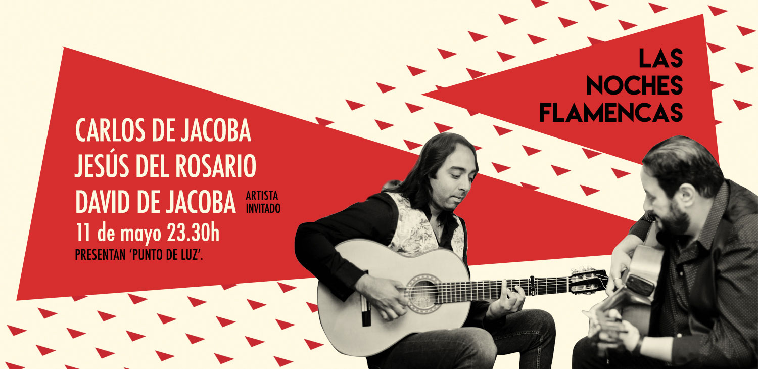 Jesus de Rosario Nace en Madrid en el barrio de Cañoroto, es uno de los grandes en el mundo de la Guitarra. Comienza a tocarla a los 5 años de la mano de su padre y maestro , El Enti. A parte de ahí acompaña a grandes figuras del cante y del baile. Crea y compone la música para grandes espectáculos con los que realiza giras por todo el mundo. Como solista, sacó su disco la “Nueva Escuela de Guitarra Flamenca” nominado a mejor disco Flamenco de los premios Grammy Latinos 2003. Carlos de Jacoba Es un guitarrista con una gran trayectoria artística, conocido en la historia del arte de la guitarra flamenca por su propio nombre, Carlos de Jacoba. Nació el 2 de septiembre de 1983 en Motil, Granada. En su toque confluyen la tradición, el conocimiento y la pasión del toque más gitano, con la modernidad, frescura y romanticismo fruto de las influencias de los grandes maestros Camarón y Paco de Lucía. Carlos de Jacoba está predestinado a convertirse en un referente de la guitarra flamenca actual.
