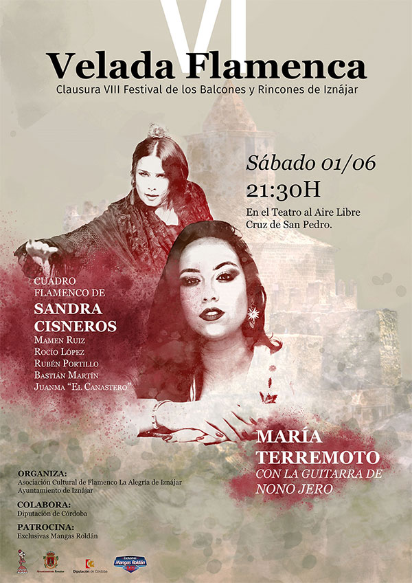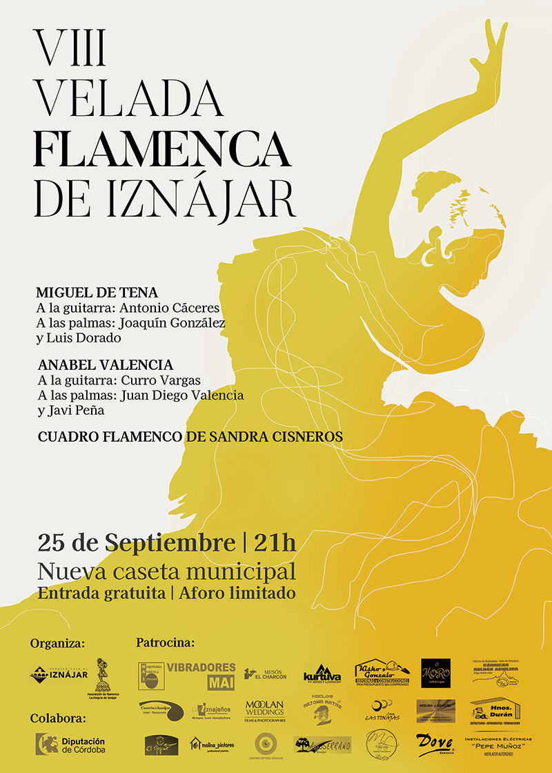 Los cantaores de flamenco Anabel Valencia y Miguel de Tena prometen un regreso de altura de la Velada Flamenca de Iznájar (Córdoba) tras el obligado parón por la Crisis Sanitaria del Coronavirus. El 25 de septiembre a las 21:00h., la Nueva Caseta Municipal al aire libre acogerá la octava edición de esta cita cuya entrada es gratuita hasta completar aforo y que contará como broche de oro con la bailaora Sandra Cisneros y su cuadro flamenco.