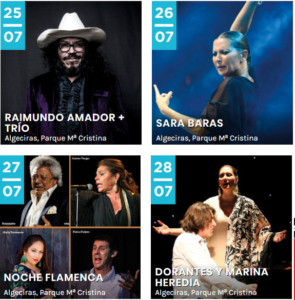 Miércoles 24 de julio José Manuel León y Alicia Carrasco «Mujer Klórica: los bienes de la tierra» Jueves 25 de julio Raimundo Amador «Directo a casa» Trío guitarras: Antonio Serrano, Antonio Sánchez y José del Tomate. Viernes 26 de julio «Sombras» de Sara Baras. Sábado 27 de julio Noche flamenca Pansequito, Aurora Vargas, María Terremoto y Perico El Pañero. Domingo 28 de julio. «Esencias» Dorantes & Marina Heredia.