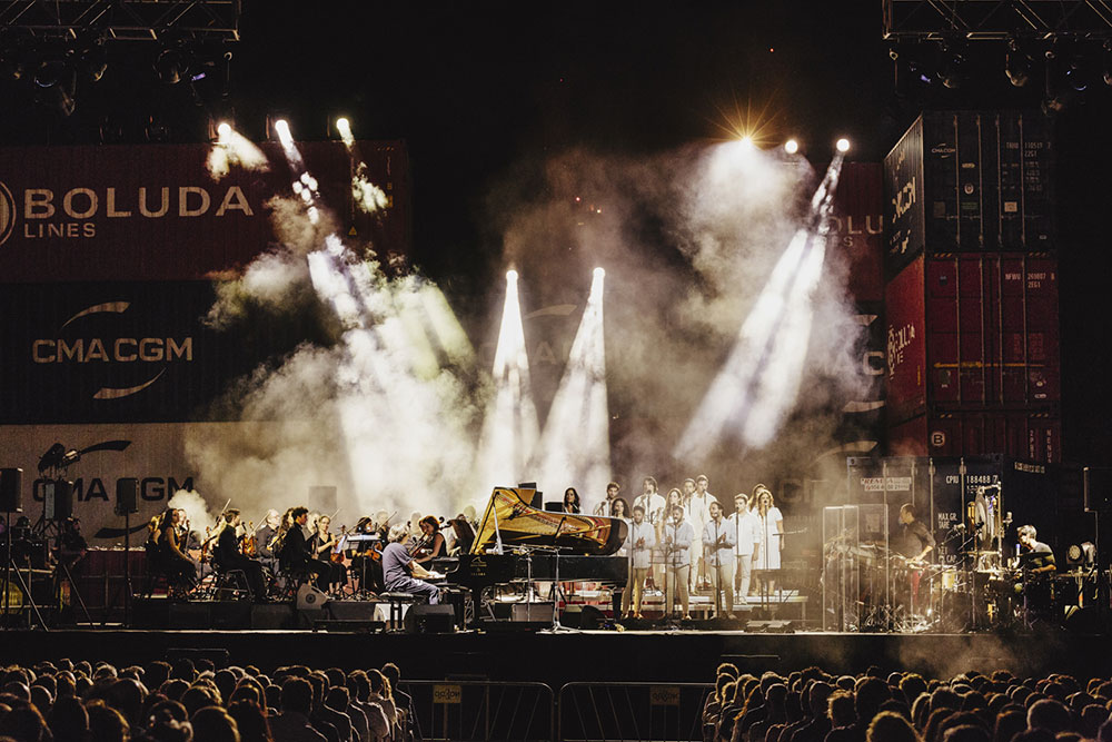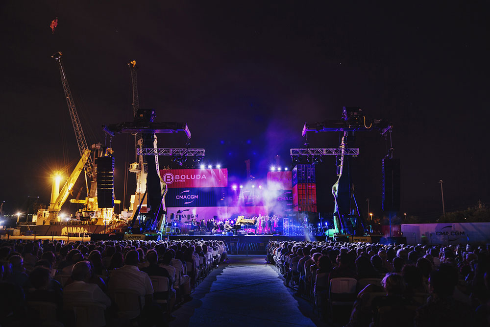 On the stage set up for the occasion with plastic chairs, several empty rows and the enclave, somewhat strange: transport containers and cranes surrounded the stage as if a fashion show were about to be filmed. It’s your choice: narcos, corruption, contraband or all of the above. Behind the Lebrija musician and his piano, the Orquesta Bética directed by Michael Thomas. On the side, the chorus of students from the Cristina Heeren Foundation, and elaborate percussion: Antonio Moreno and Javi Ruibal. It was these two, along with the pianist, who served the musical aperitif: a delicious morsel in which they made rhythm with a container using hands, bodies and drumsticks.