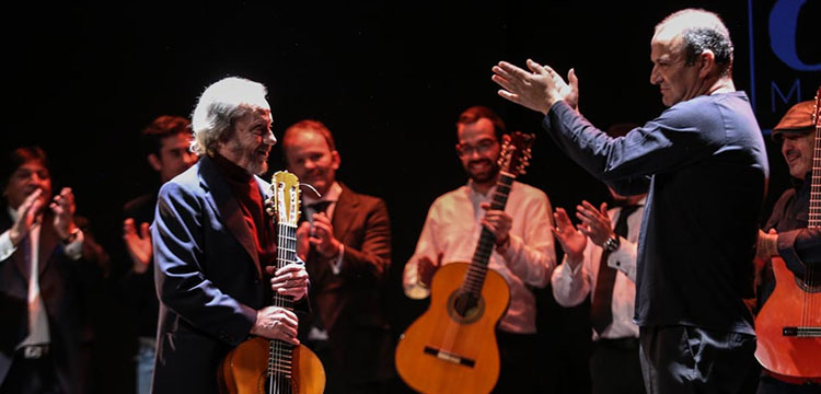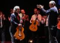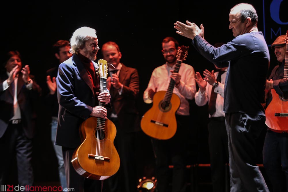 Neither flamenco nor Spanish music in general have prizes for congratulating its interpreters. And what’s more, our history, our pride and our future rests in the hands of Hispanophiles, always from abroad. It’s not possible to understand why this type of tribute does not originate in the Cultural Ministry, but is relegated to the blessed hands of Madrid’s Teatro Flamenco, a private enterprise under the direction of Javier Andrade who pointed out that the theater’s personnel went all out, as if this were a Hollywood gala. Shortly following, Ramírez guitars, with whom Víctor Monge has been associated throughout his career, offered him a copy of the family jewel, a solid gold guitar.