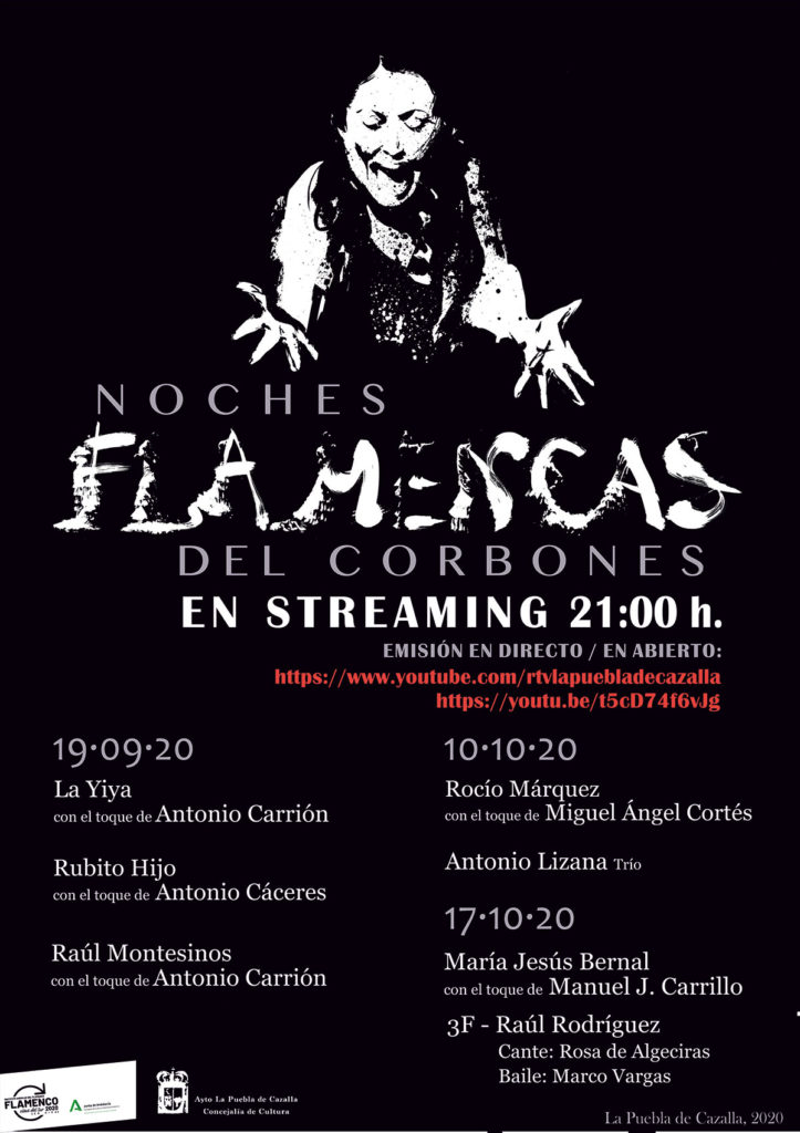 El Ayuntamiento de La Puebla de Cazalla (Sevilla) ha decidido mantener la programación flamenca ‘Las Noches Flamencas del Corbones’ para su emisión en streaming a través de su canal de Youtube https://www.youtube.com/rtvlapuebladecazalla. Serán los días 19 de septiembre, 10 y 17 de octubre y cuenta en su programación a cantaores como La Yiya, Rubito hijo, Raúl Montesinos, Rocío Márquez y María Jesús Bernal. En el programa también están programados Antonio Lizana trío y Raúl Rodríguez con su tres flamenco.
