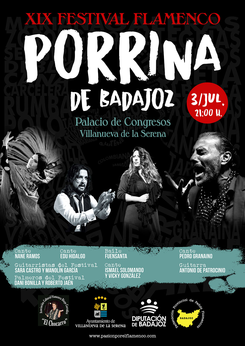 El Festival Flamenco Porrina de Badajoz, que patrocina la Diputación de Badajoz con la colaboración de la Federación Provincial de Peñas Flamencas de la provincia de Badajoz, regresa tras la cancelación del pasado año debido a la pandemia, para celebrar el próximo sábado 3 de julio (21.00 horas) en Villanueva de la Serena su decimonovena edición con un atractivo cartel que incorpora algunas de las voces más reconocidas del cante actual y con el que pretende situarse de nuevo como una de las citas culturales imprescindibles para los aficionados y aficionadas extremeños.