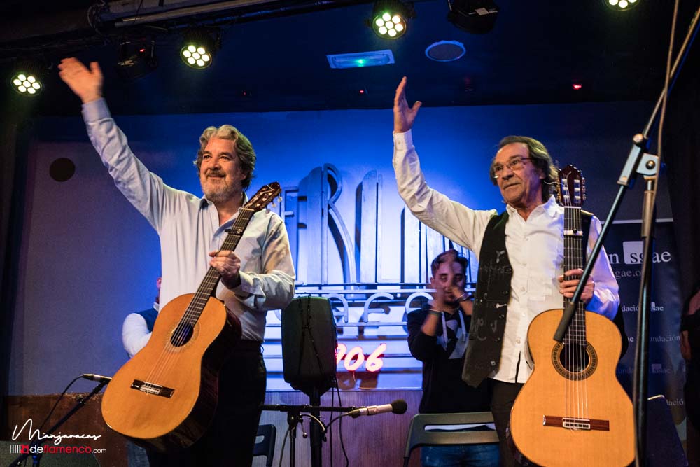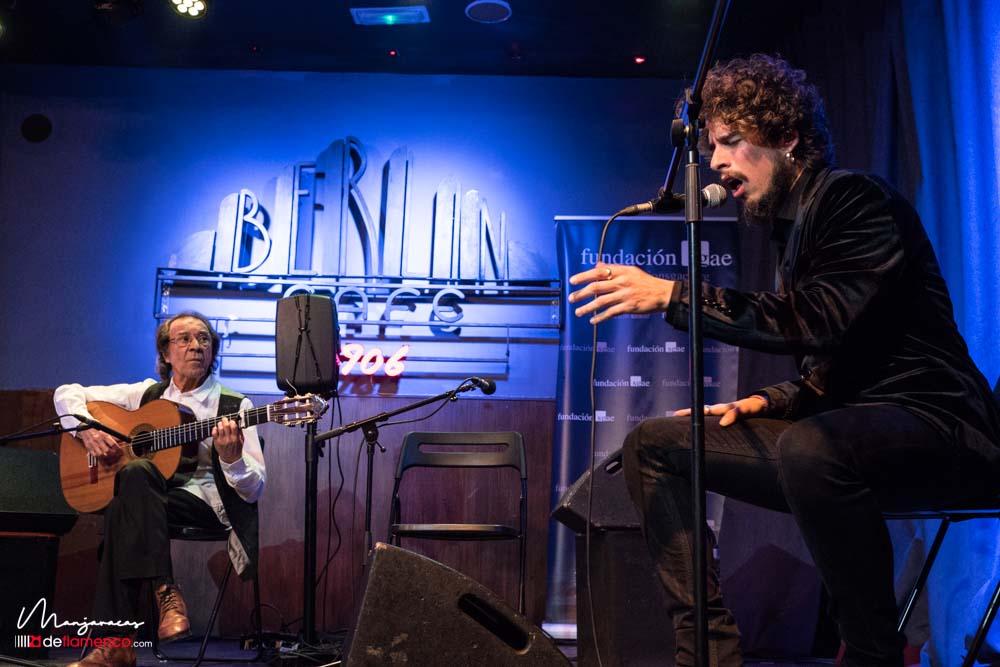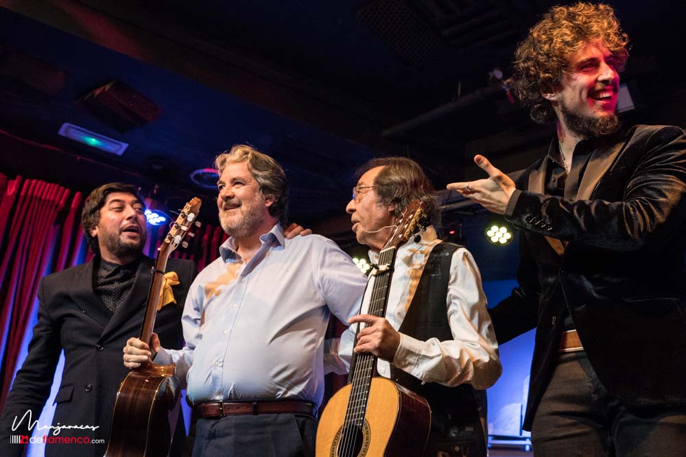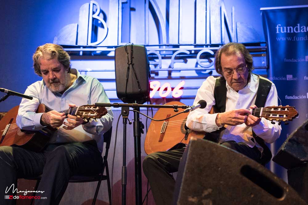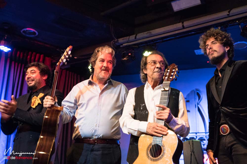 Broche de oro para el 3º Festival Flamenco de Club del Café Berlín, los maestros de la guitarra Rafael Riqueni y Pepe Habichuela juntos en el escenario del Berlín, primera parte recital de guitarra flamenca de Rafael Riqueni donde adelanta algunos temas de su próximo disco previsto para el mes de enero y que se titulará ‘Herencia’, Kiki Morente le acompañó al cante. Segunda parte, el maestro Pepe Habichuela sólo de guitarra, luego acompañado por seguiriyas acompañado por Bandolero en la percusión, Kiki Morente le acompaña al cante, antes de la incorporación de Rafael Riqueni, los dos maestros juntos en una actuación única. Kiki Morente, el cantaor ‘mas afortunado del mundo’ -le indicó Estrella Morente- por el acompañamiento de los maestros, figuras ligados a la trayectoria de Enrique Morente. El delirio llegó con la interpretación de los tangos ‘Aunque es de noche’ y con un fin de fiesta al que se sumaron muchos de los artistas presentes, Lucas Carmona, Bandolero, Las Negris, Estrella Morente, Kiki Morente y los maestros.