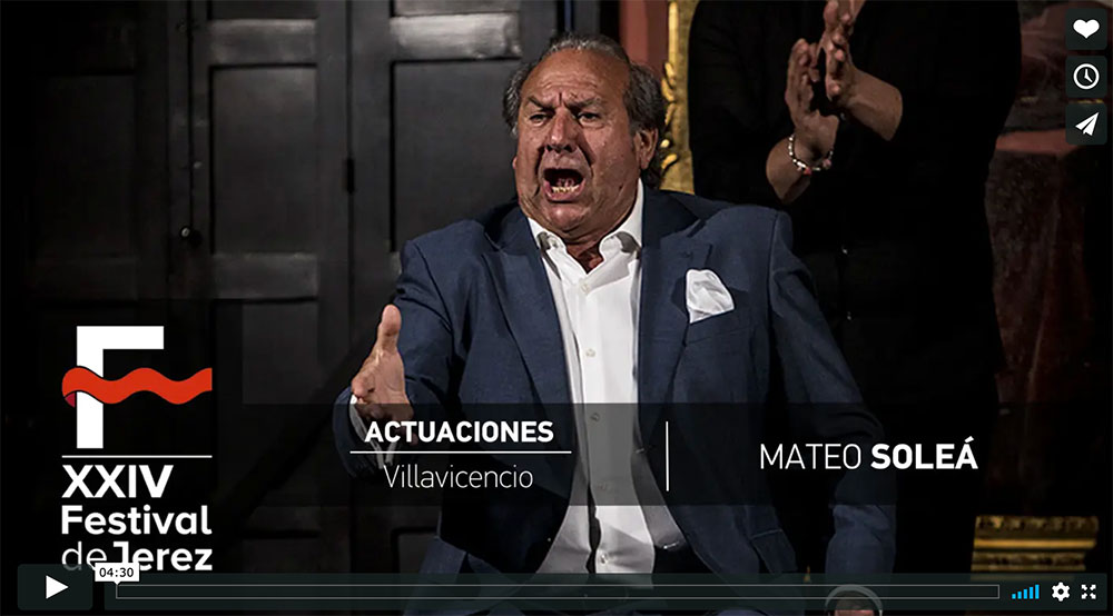 Video resumen de la actuación que el cantaor Mateo Soleá ofreció en el Palacio de Villavicencio un completo recital de cante acompañado a la guitarra por Antonio Malena hijo y Ale Fernández y Javier Peña a las palmas. Festival de Jerez – 4 de marzo 2020.