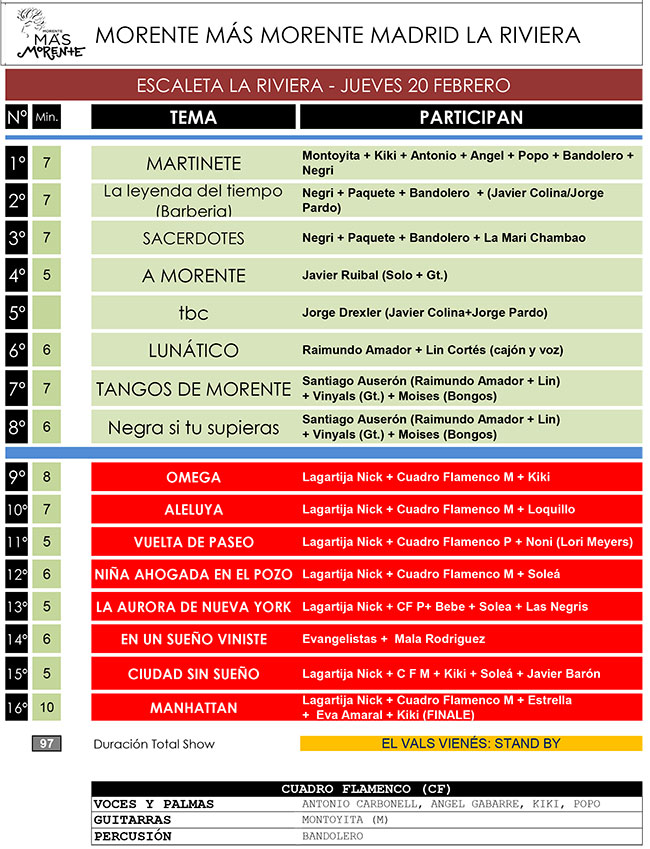 El concierto se abrirá con la emocionante capela que interpretan, flamencos a rabiar, de pie en el centro del escenario al compás de un martinete. Una primera parte del espectáculo con cuadro flamenco y una línea acústica en la delantera del escenario en el que los colaboradores, vocales e instrumentales se sucederán en temas de Enrique que todos ellos compartieron con él y han preparado para la ocasión. El ecuador del show lo marca la iluminación de una línea trasera de guitarras eléctricas y batería, el sonido Omega total, cuadro flamenco delante y el colchón rockero para los cantes del Maestro que interpretarán en esta noche los colaboradores del Memorial que se sucederán uno a uno en el turno de voces, guitarras y percusión para ofrecer el repertorio más completo de Omega que se ha podido reunir tras leer y releer tantos repertorios manuscritos por Enrique (uno distinto cada actuación) para sus sucesivas y nunca iguales actuaciones de Omega. Una noche, como no podría ser de otra manera, de empuje y riesgo, de respeto y admiración porque su obra está más viva que nunca”.