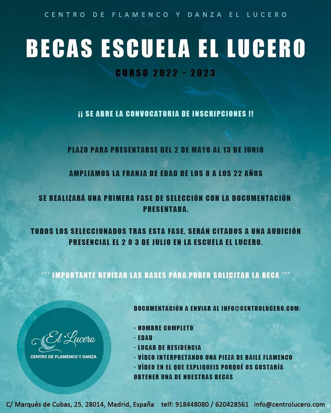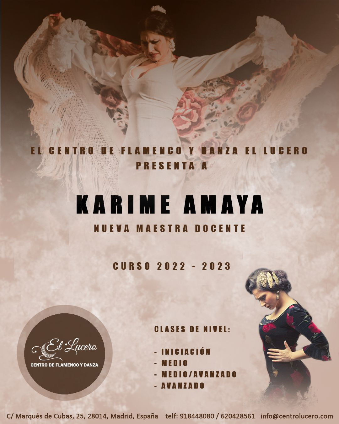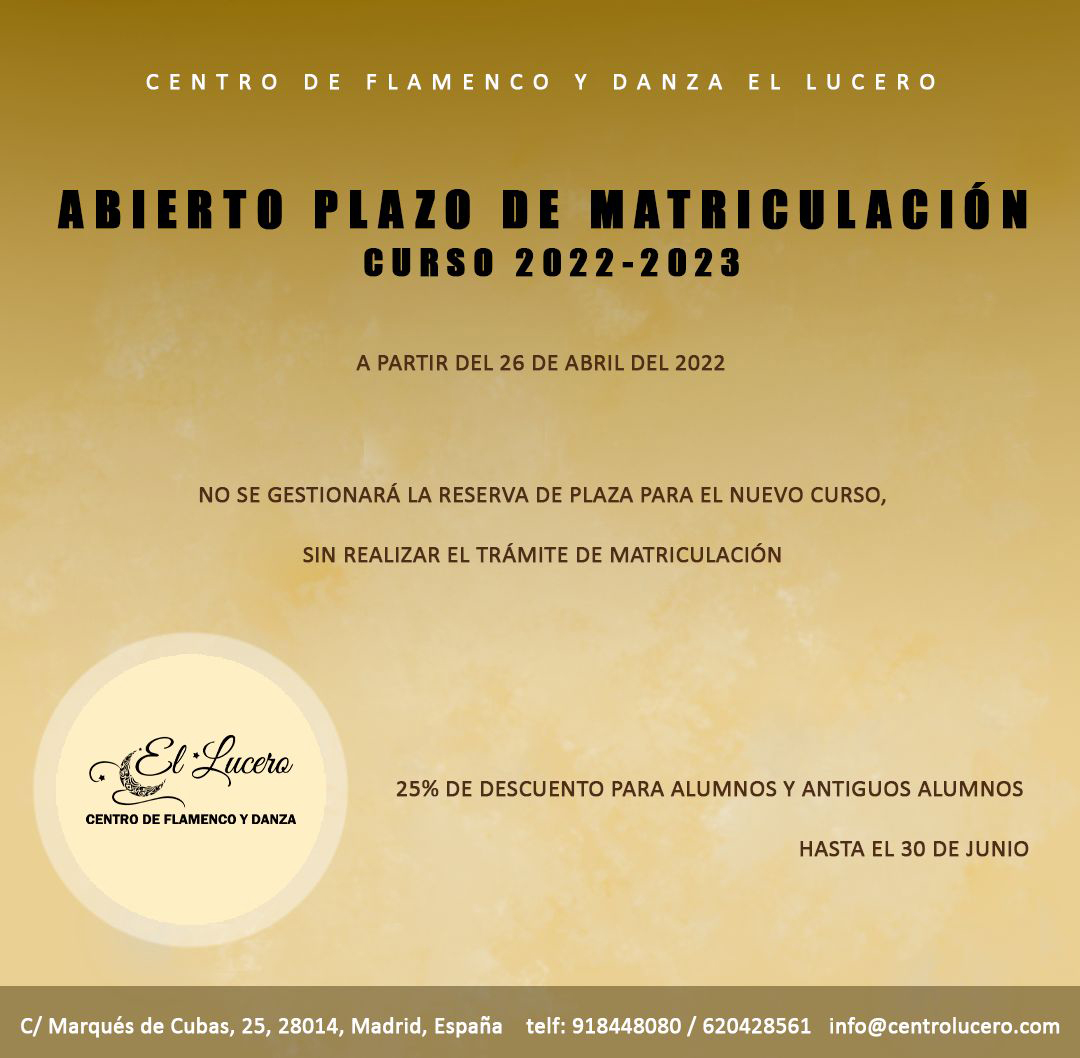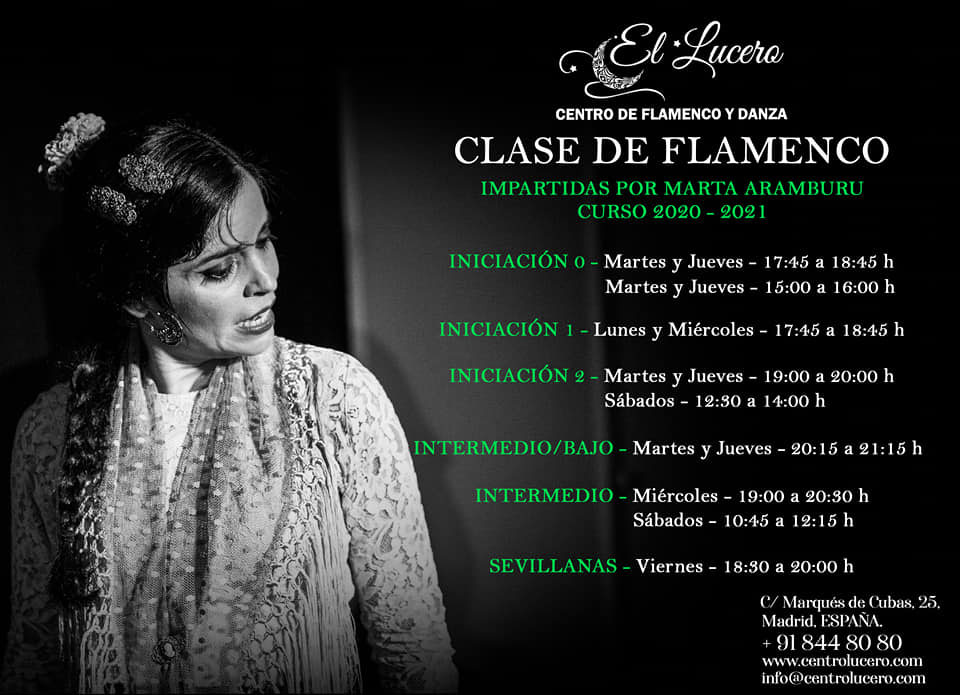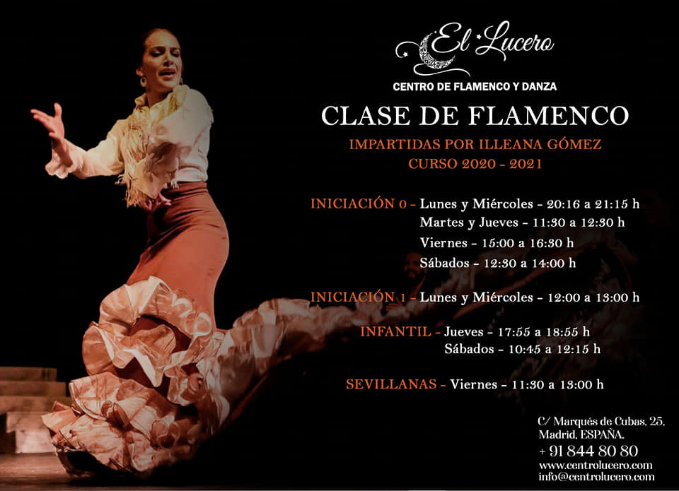 El Lucero es una escuela de flamenco y danza situada en pleno corazón de Madrid, que además de clases regulares, ofrece exhibiciones, cursos y talleres de varias modalidades artísticas y de bienestar. De la mano de sus experimentadas profesoras y profesores podrás aprender a bailar, tocar y cantar todos los palos del flamenco, además de adquirir la técnica necesaria para poder desenvolverte en cada uno de ellos.