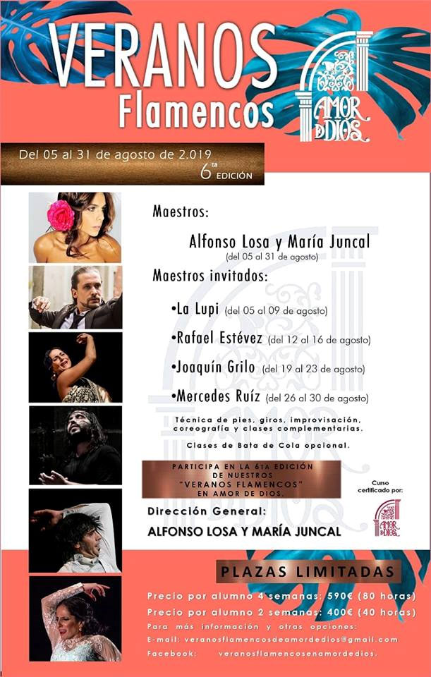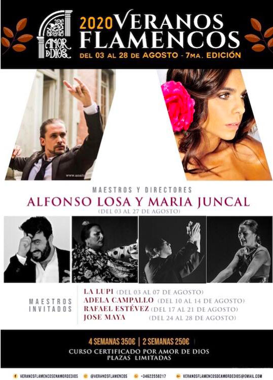 Por septimo año consecutivo se van a celebrar los Veranos Flamencos en Amor de Dios que en esta edición van a estar protagonizados por La Lupi, Rafael Estévez, Adela Campallo y Manuel Liñán como maestros invitados, además de Alfonso Losa y Maria Juncal como maestros principales y directores generales.Los Veranos Flamencos en Amor de Dios es una iniciativa para la formación en danza flamenca impulsada por María Juncal y Alfonso Losa, dos de los artistas más reconocidos internacionalmente y estrechamente ligados al Centro de Arte Flamenco y Danza Española Amor de Dios, el más antiguo y emblemático de Madrid y una de las academias más prestigiosas del mundo.