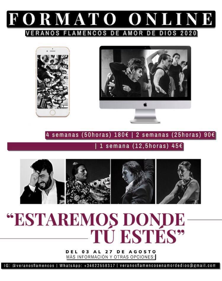 [ONLINE VERSION] •Our Veranos Flamencos will be where you are, and even if it is through a screen, we are very happy to be able to share with all of you !! We will have our directors and guest teachers, performances, and much more.. 4 WEEKS € 180 | 2 WEEKS € 90 | 1 WEEK € 45. ℹ️: +34622558317