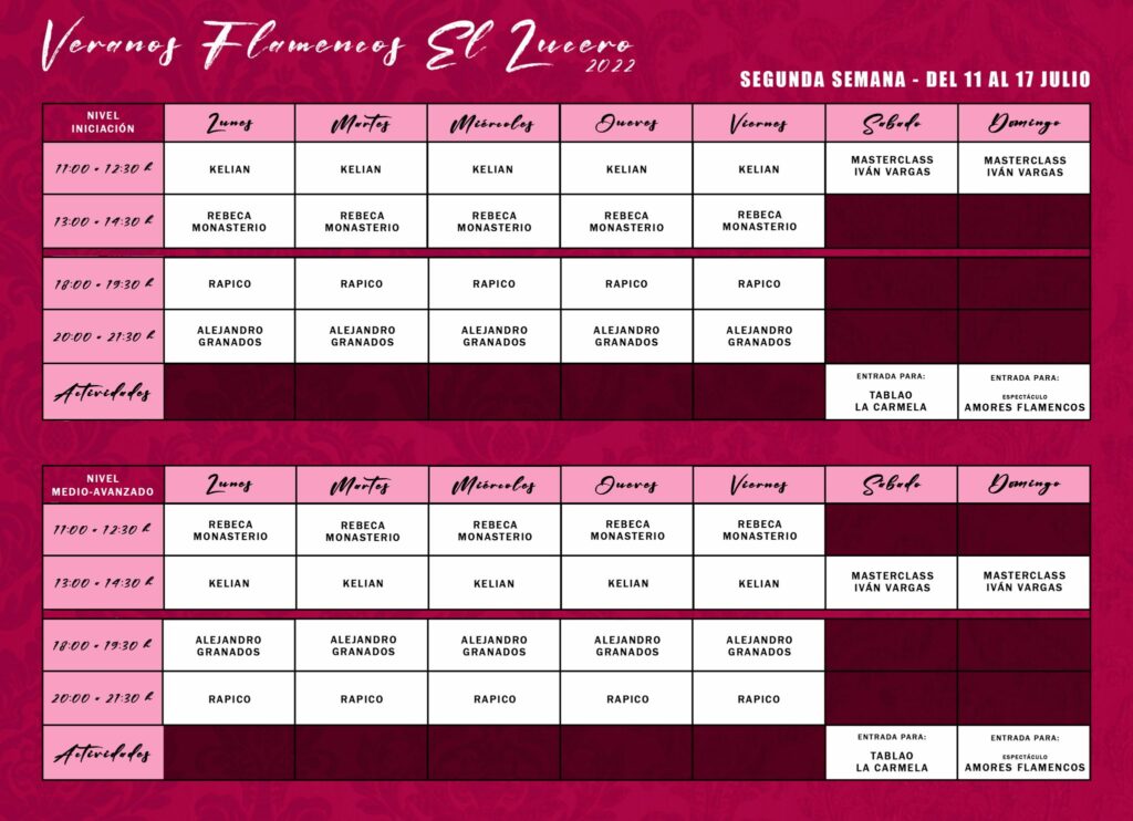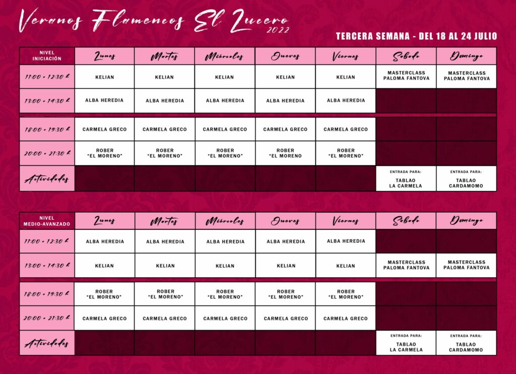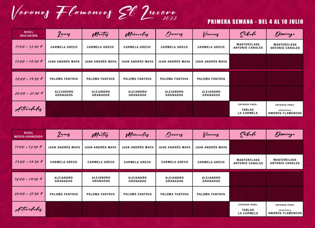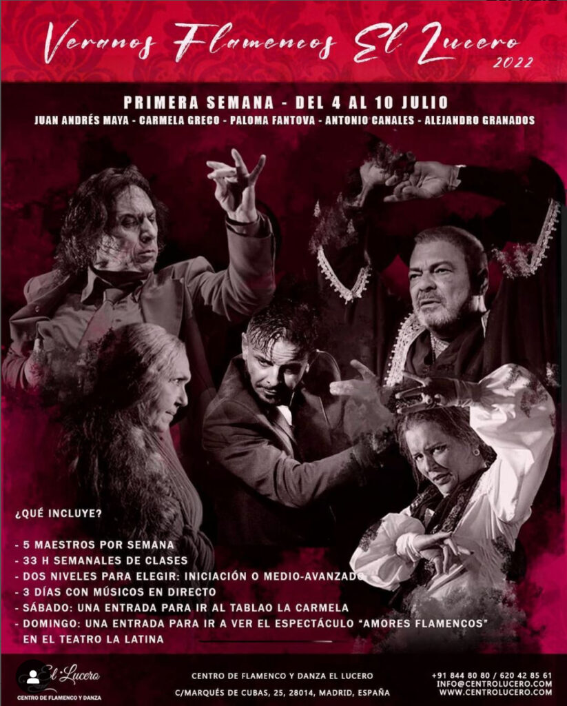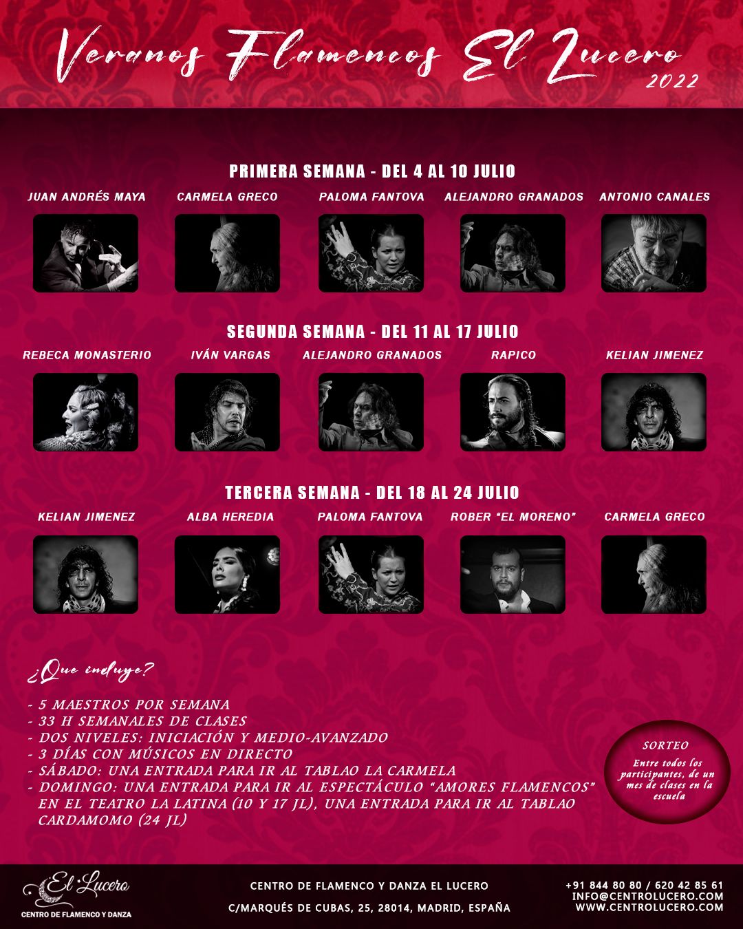 Desde el 4 de julio al 24 de julio 2022 pasarán por las clases de la Escuela de Flamenco El Lucero maestros flamencos como Carmela Greco, Juan Andrés Maya, Antonio Canales, Alejandro Granados, Paloma Fantova, Kelián Jiménez, Rebeca Monasterio, Iván Vargas, José Rapico, Alba Heredia…