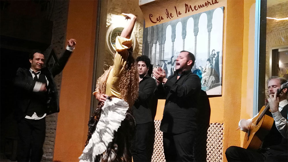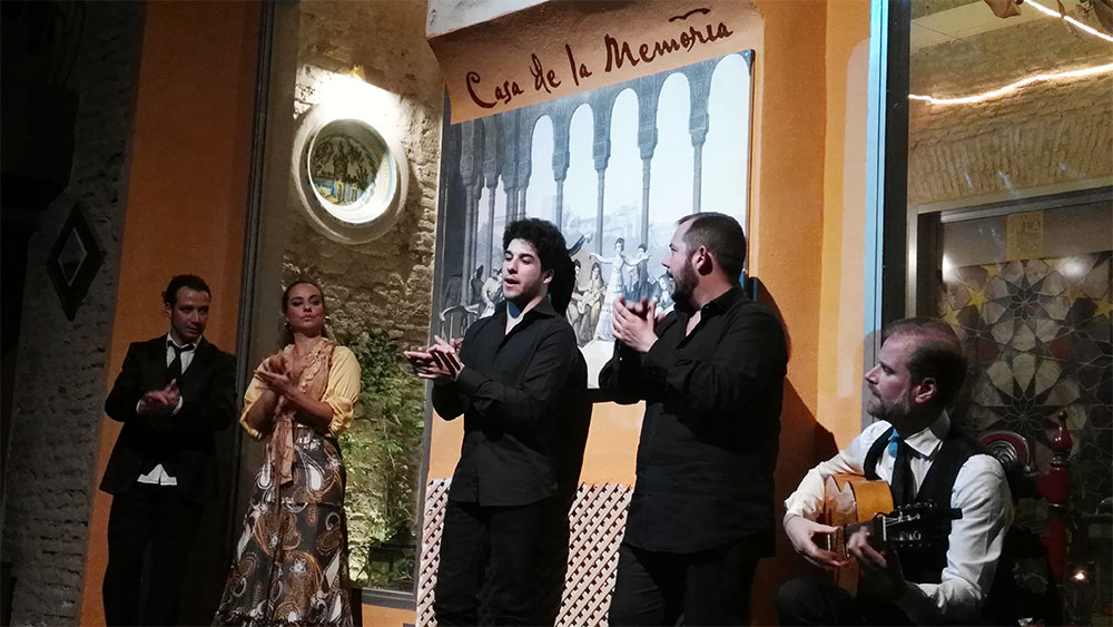 Tras la introducción, el espectáculo se inicia con la voz dulce y sentimental de Jeromo Segura por cantiñas: alegrías, romeras, caracoles. Con una iluminación sencilla e íntima y el cante enjundioso, casi susurrado, del onubense. Segura es uno de los más reputados intérpretes jondos de hoy, ganado de la Lámpara Minera en 2013, y autor de una sobresaliente obra grabada. Marina Valiente irrumpe por soleá. Segura, categórica, intempestiva. Cuando ella llega rola el viento. No deja indiferente. Esta bailaora derrocha energía y fiereza. Su baile es estrictamente físico, percusivo. Segura y Sánchez la siguen con mimo y profesionalidad a prueba de bombas. Valiente puede llevar su baile lo lejos que desee con la certeza de que tendrá dos custodios que no le van a fallar. Y tras esta explosión de vigor, de nuevo la penumbra se apodera del escenario para introducirnos un toque clásico por granaínas. Refinado, sereno, redondo. El segundo número de baile corresponde a la elegancia y las sutilezas de Felipe Mato. El sevillano puede ser eléctrico, y lo es cuando corresponde. Pero también es capaz de ofrecer matices, deliciosos arabescos y “encajes de bolillos” que forman parte de una tradición flamenca que a veces se ve arrollada por el ímpetu, el frenesí de nuevo cuño. La cosa se cierra con un fin de fiesta con los solistas bailando a dúo, igual que habían hecho en la introducción por jaleos. El escenario de La Casa de la Memoria ofrece a los intérpretes y al público un ambiente sosegado, casi místico, que el público sabe recompensar con una larga ovación.