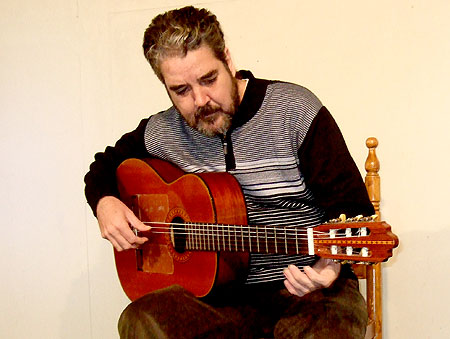 It’s also true that a lot of what I know I learned on my own. Over the years, after having gone to the conservatory, I needed to arrange things for other string instruments, and I learned little by little from that book over there, a friend of mine gave me…and, well, if I have to do a bulería, I don’t write it, but in the case of “Nana de Orihuela”, which is a fantasy I composed in honor of Miguel Hernández, then I turn to written music, it’s much more useful. I can’t compare myself to a studied musician, but, well, for my own needs I get by.