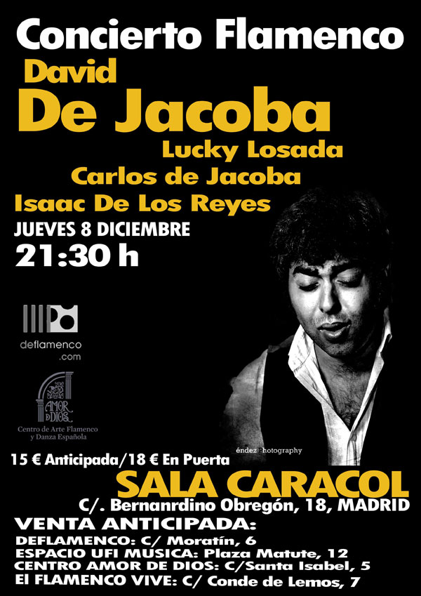 The discerning eye of Paco de Lucía discovered him three years ago, and since then his name has circulated so much that his brother, his “alma mater“ as he himself calls him, encouraged him to make a first recording that’s now in the works. In a few months “Jacobeo”, the recording debut of David Maldonado Santiago, “David de Jacoba” (Motril, Granada, 1985), will be released. For the moment, and with the invaluable help of the Amor de Dios flamenco school, in December he’ll be with his brother Carlos, Lucky Losada and Isaac de los Reyes, also present at Madrid’s “Caracol”. Just to get things underway. How’d it go in Turkey with the maestro (Paco de Lucía)? It looks like flamenco is in your family. Who was Jacoba? Is there a flamenco ambience in Motril and Granada? I suppose it was through Josele that you came to be with Paco de Lucía. And the idea of making a recording? Isaac de los Reyes: You’re going to see how this record makes a big splash. Just look at me, I have my flamenco hopes and dreams, I don’t mean about singing or making a record, just about flamenco as an absolute as it occurs in David. This is a guy who is very expressive, all heart, a love of looking back and listening to the historic singers…he’s going to surprise you all. I saw it a lot in my much-admired Enrique Morente with whom I was lucky enough to spend some time. I wish he could be here right now, he appreciated this thing of where we flamencos come from. In my generation there’s a lot of talent, but you have to always be looking back, I never get tired of repeating that.