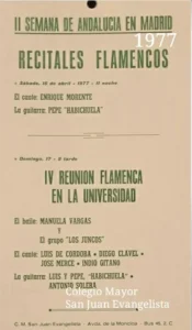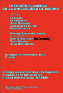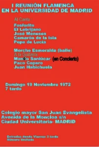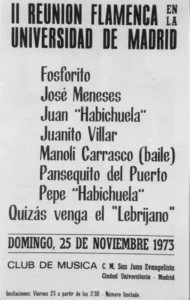 Reyes era consciente de su labor histórica que se refleja en la meditada forma de presentar los conciertos: “Primera Reunión de Arte Flamenco en la Universidad” noviembre de 1972 en el que están presentes: Fosforito, El Lebrijano, José Meneses, Camarón de la Isla, Pepe de Lucía, Merche Esmeralda en el baile. La guitarra de Concierto de Manolo Sanlúcar y el toque de Paco Cepero y Juan Habichuela. Al año siguiente se celebra la segunda edición y ahí encontramos una singularidad en el cartel que completa los protagonistas con un “quizá venga el Lebrijano”.