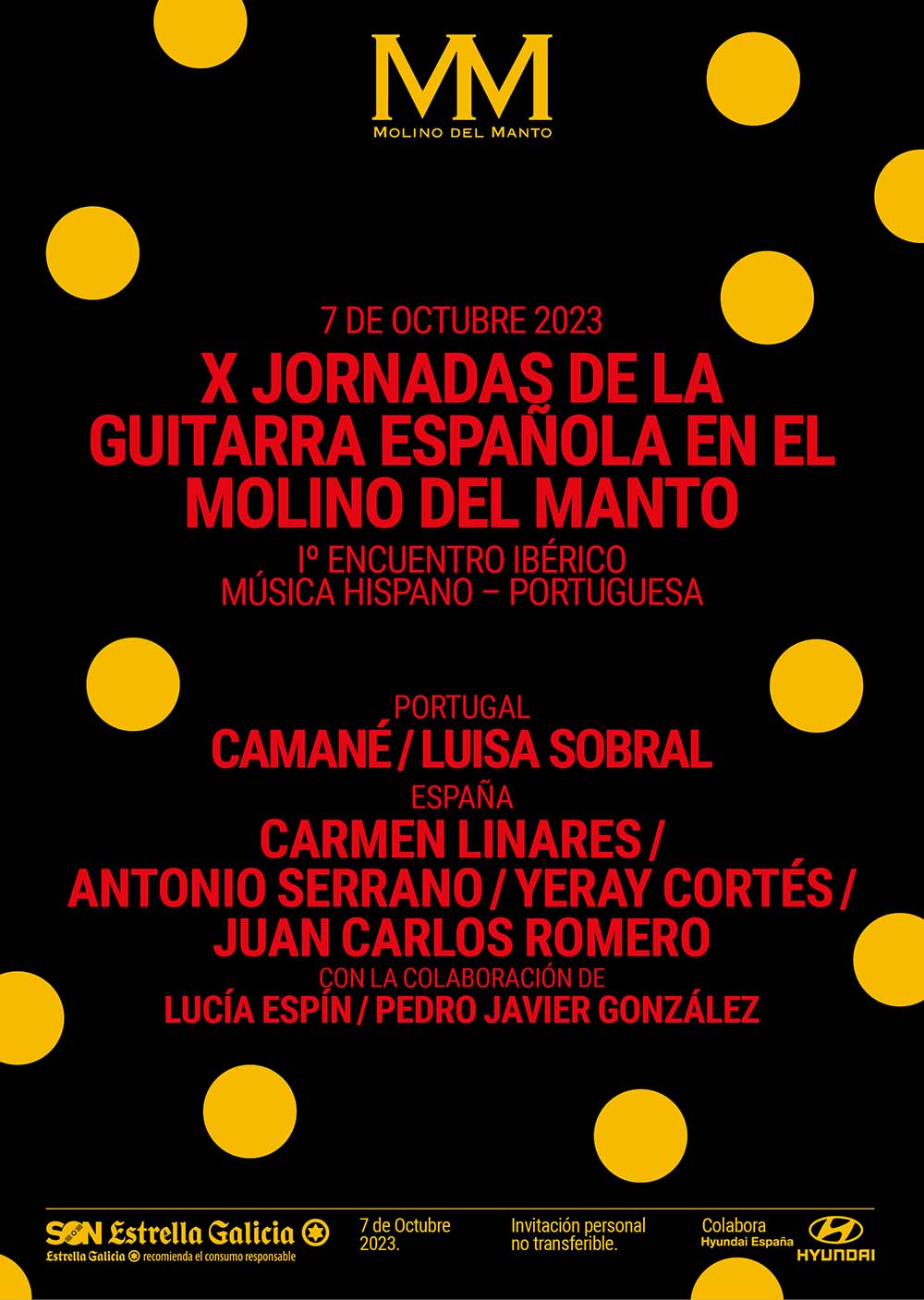 Ahora llega el I ENCUENTRO IBÉRICO DE MÚSICA HISPANO LUSA el día y 7 de octubre una forma especial de celebrar la décima edición de las JORNADAS DE LA GUITARRA ESPAÑOLA ESTRELLA GALICIA que se han venido celebrando en el Molino del Manto (Chinchón, Madrid).