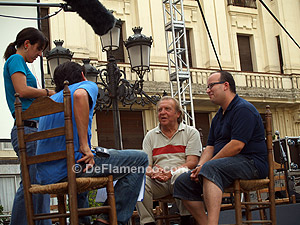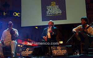 | Al caer la tarde, Lebrijano y Faical atienden una entrevista, en el escenario que una hora después se encontraba a rebosar de público. |