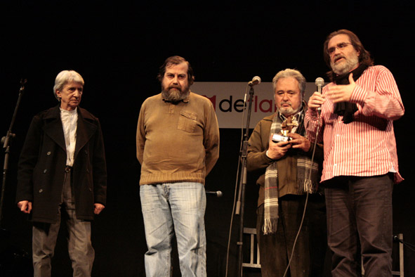 Balbino Gutierrez hace entrega a la MENCIÓN ESPECIAL a la Asociación El Planeta -Eduardo, Bruno, Manuel- por el 25 aniversario de las Jornadas Flamencas de Fuenlabrada.