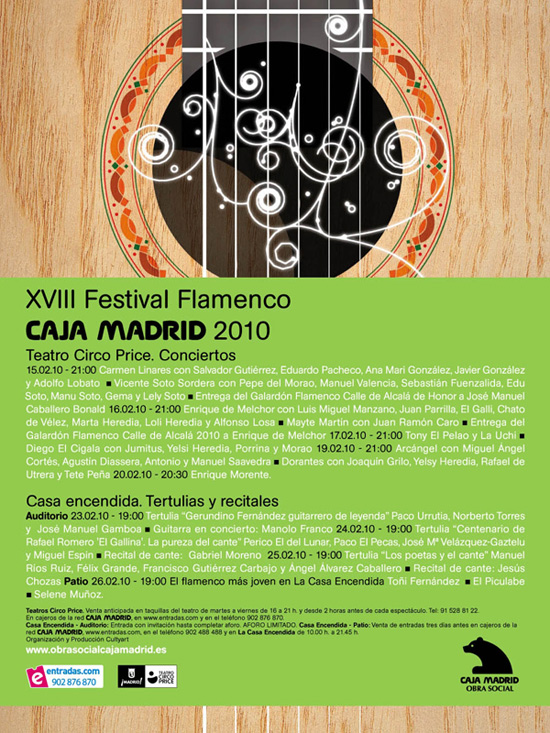 Cante: VICENTE SOTO SORDERA Pepe del Morao y Manuel Valencia, guitarras; Sebastián Fuenzalida, violonchelo y bajo; Edu soto, piano; Manu Soto, percusión; Gema y Lely Soto, palmas y coros. Dirección musical: Vicente Soto «Geografías flamencas: Sevilla, Jerez, Cádiz» (incluye poemas de Antonio Machado, Rafael Alberti, Caballero Bonald?)