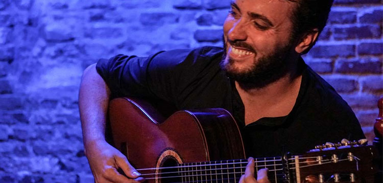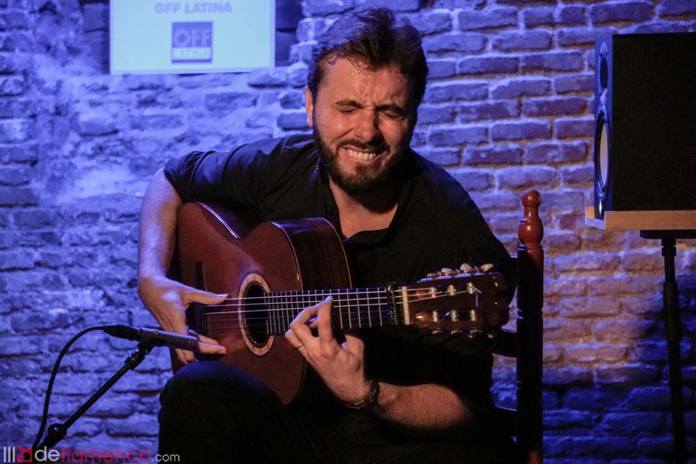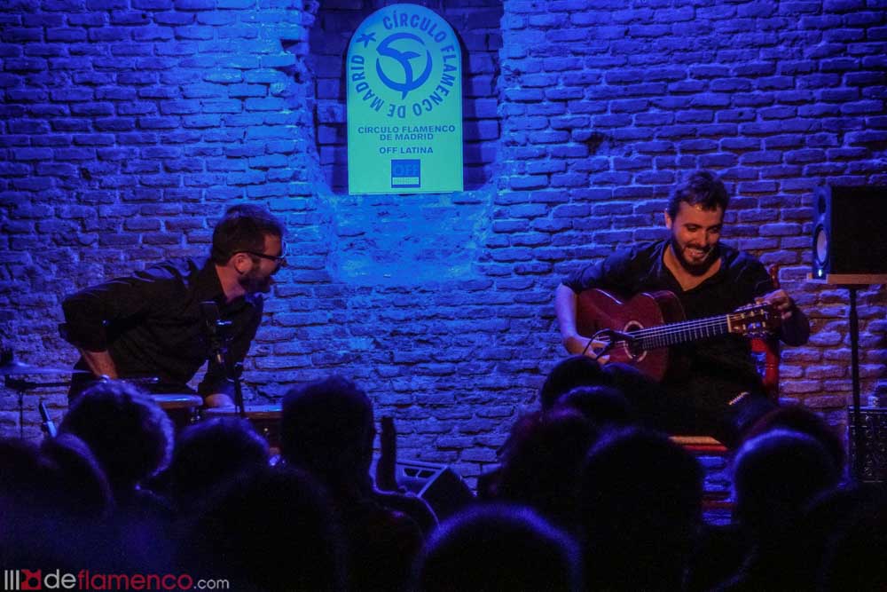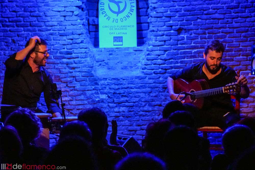 Jesús Guerrero, guitarra flamenca en el Círculo Flamenco de Madrid, acompaña a la percusión Paquito González. 25 octubre 2018 – Sala Off Latina.