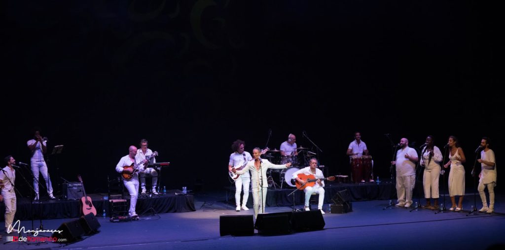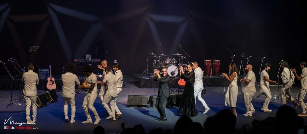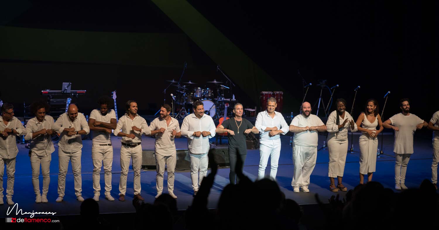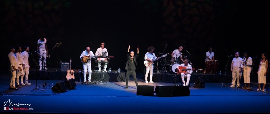 Así, vestido de blanco inmaculado como el resto del elenco, el cantante salió al escenario, se dejó aplaudir, se quitó la mascarilla con la que aparecieron todos y lució una ensayada sonrisa tras la que arrancó el espectáculo fusionando tonás con música negra en lo que recordó el inicio de El rey León.