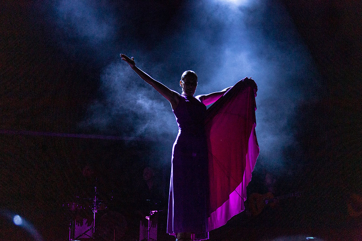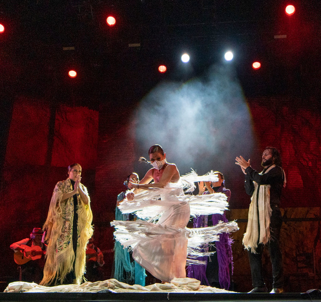 Como comienzo de la actuación, la compañía al completo se puso una mascarilla de lunares durante la introducción, gesto ejemplar que levantó la primera gran ovación de la noche, aunque se sucedieron muchas: tras la guajira, la serrana y el martinete que seguían en el repertorio y que hicieron disfrutar al público con el poderío de Sara Baras y toda su banda de músicos y cuerpo de baile.