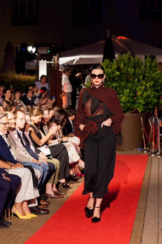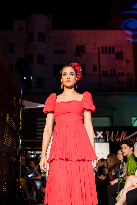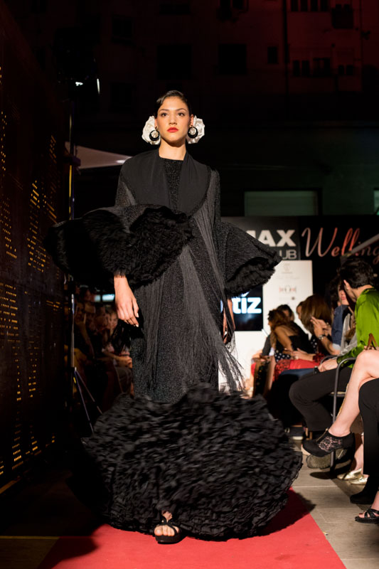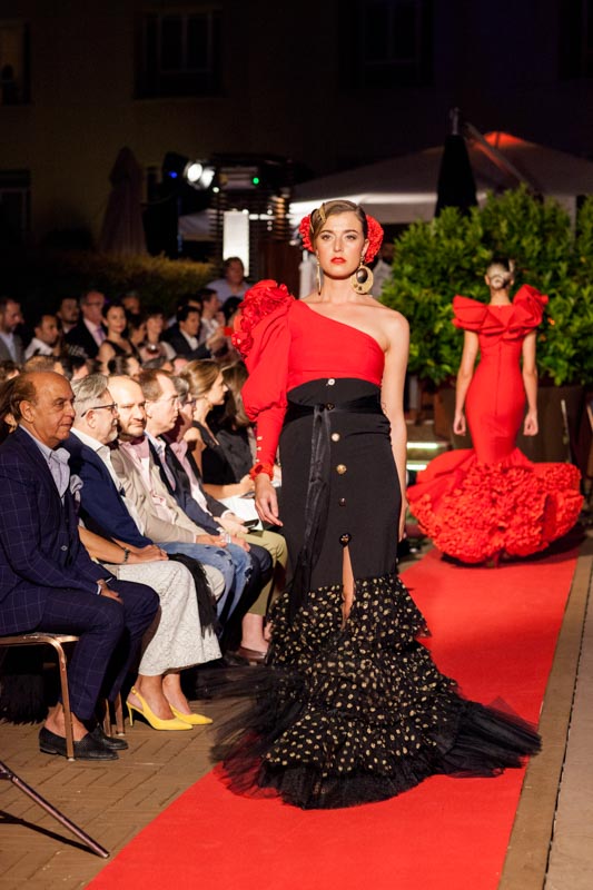 Mientras, Adelina Infante se inspiró en la ‘Dualidad’ entre el yin y el yang, impregnando su diseño de simetrías, volantes grandes y canasteros, volumen y vuelo. Por su parte, la veterana Pilar Vera optó por un vestido de lunares y bomber, en el que rindió homenaje a Sevilla.