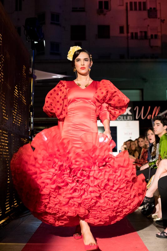Mientras, Adelina Infante se inspiró en la ‘Dualidad’ entre el yin y el yang, impregnando su diseño de simetrías, volantes grandes y canasteros, volumen y vuelo. Por su parte, la veterana Pilar Vera optó por un vestido de lunares y bomber, en el que rindió homenaje a Sevilla.