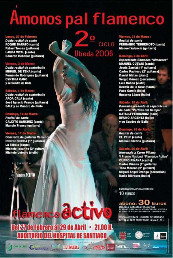Por segundo año consecutivo y con la organización de Flamenco Activo, jovenes valores del arte flamenco, junto a figuras como Fernando Terremoto, Calixto Sánchez o Pedro Sierra llevarán sus propuestas al bonito Auditorio Hospital de Santiago de la ciudad jienense de Úbeda.