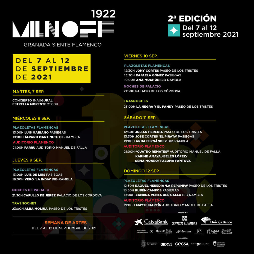 La segunda edición de Milnoff volverá a llenar Granada de flamenco del 7 al 12 de septiembre. Durante casi una semana, la ciudad podrá disfrutar de más de 20 espectáculos con artistas de primer nivel, de los que más del 70% serán con entrada gratuita.